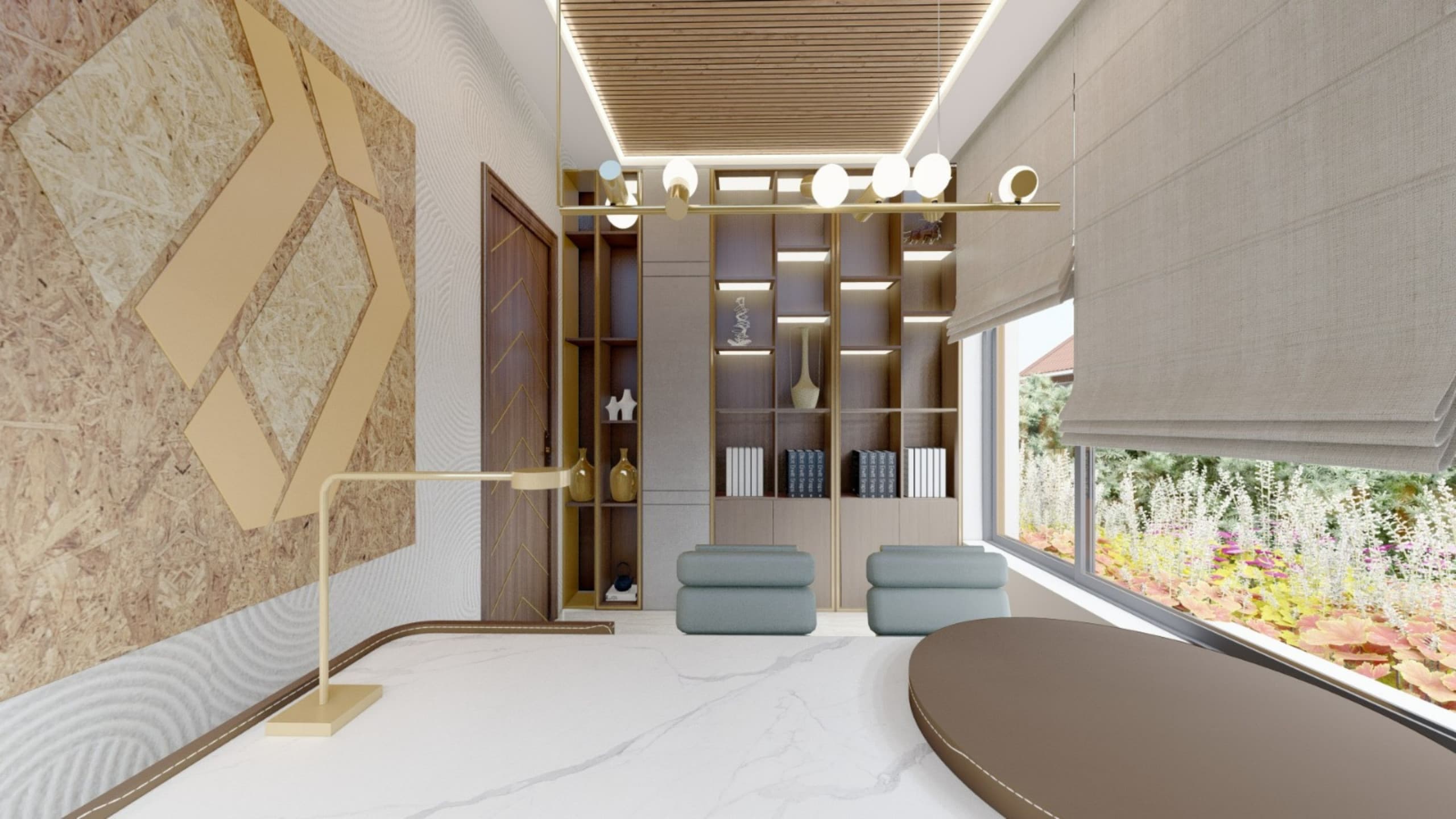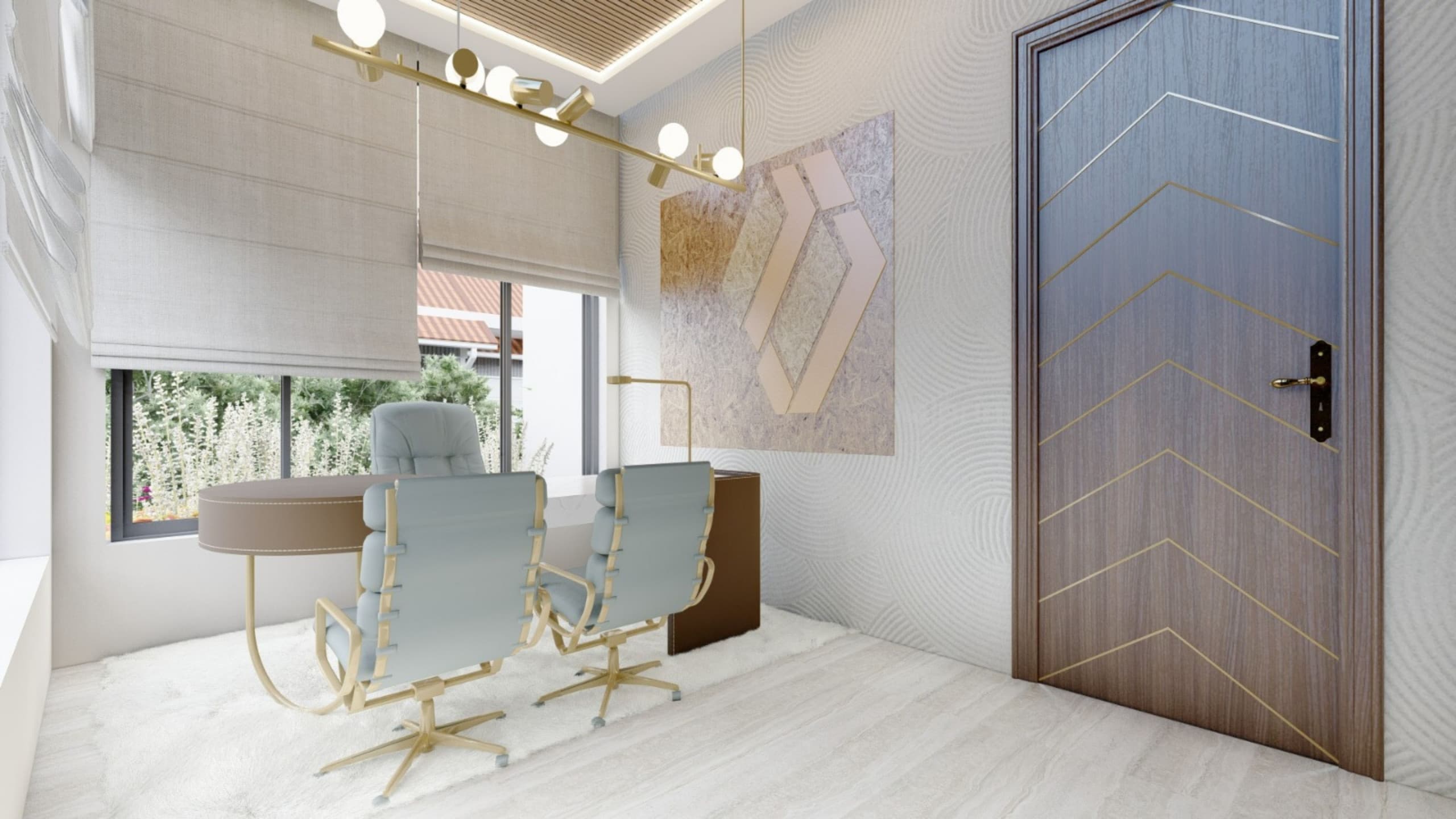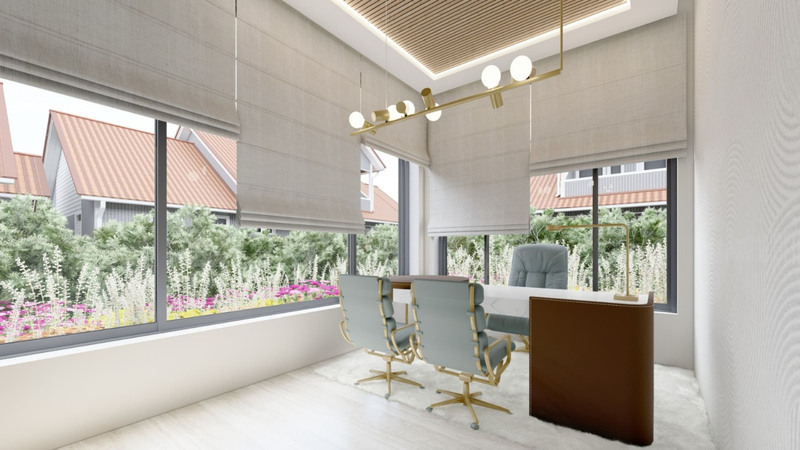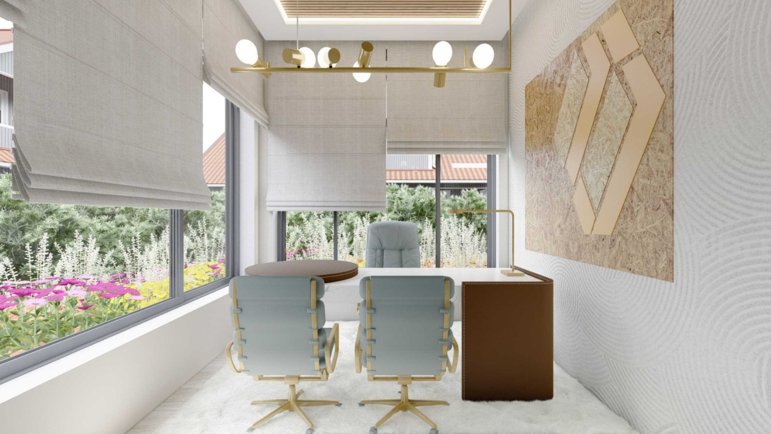 Biophilic office design, haven-like interiors, nature-inspired, luxurious feel, high-end materials, organic textures, natural light, green walls, premium furnishings, calming ambiance, modern elegance, sustainable elements, wellness-focused, serene workspace, sophisticated and inviting atmosphere.