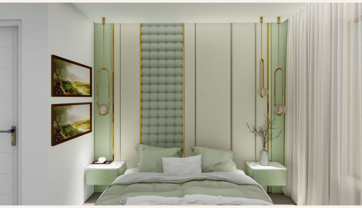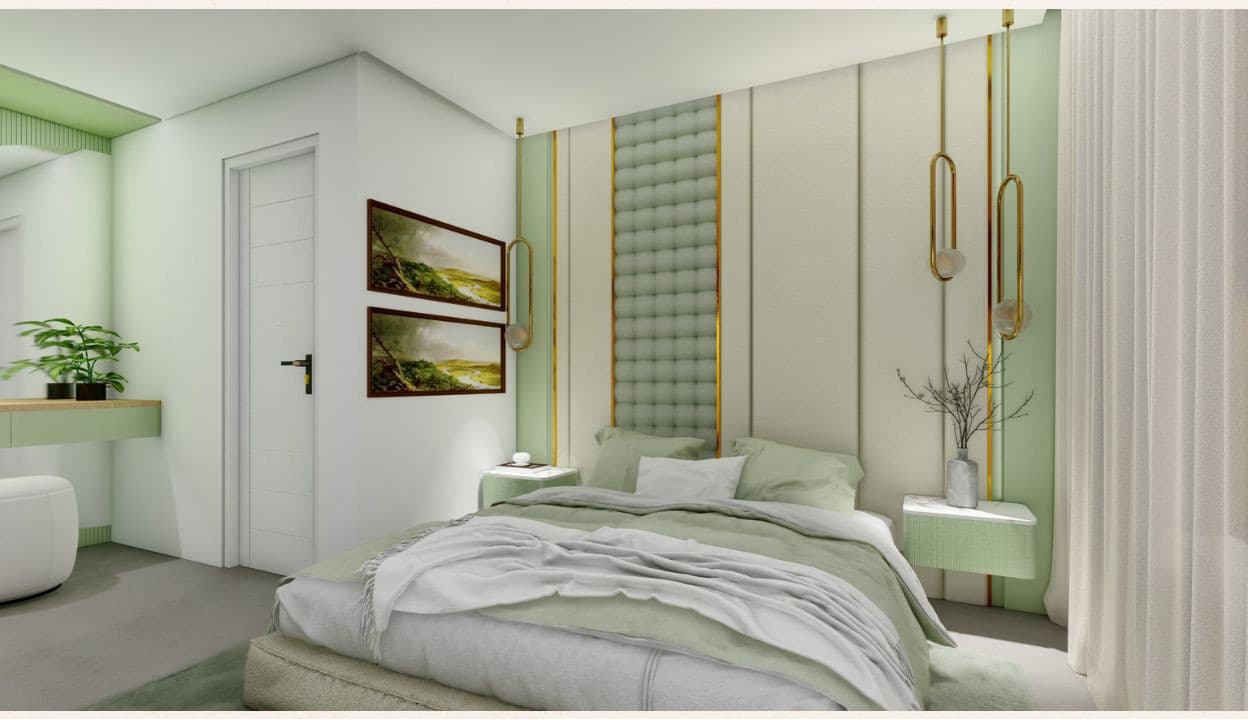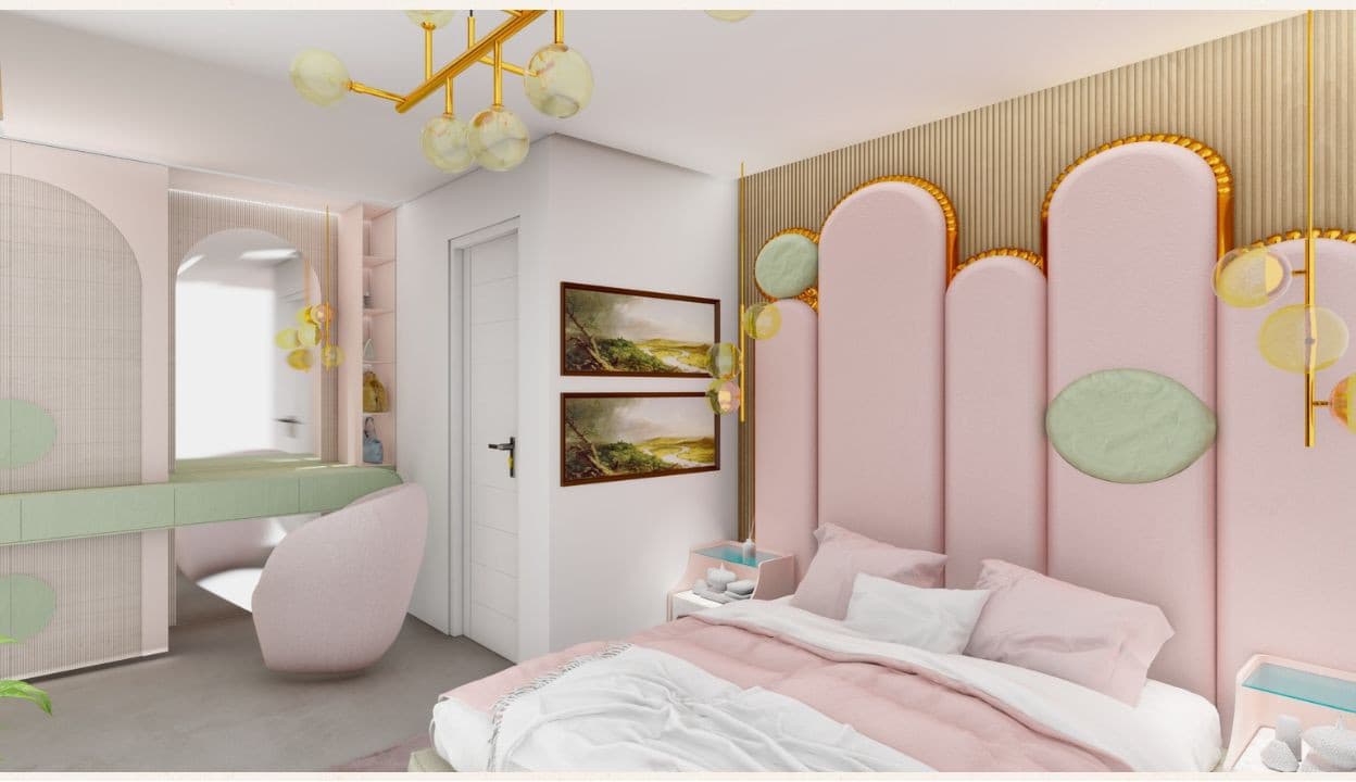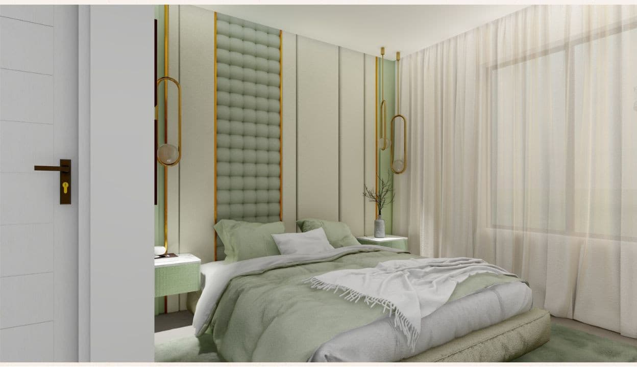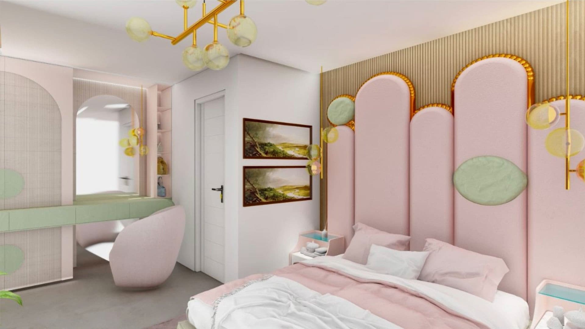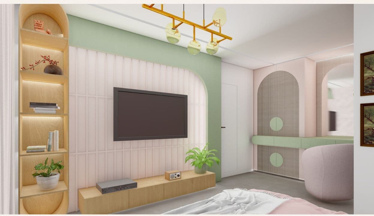 This project features a contemporary bedroom design that combines pastel tones and soft green accents with elegantly curved forms and natural wood textures. The space is enhanced by bespoke furniture, integrated shelving, and functional layouts, creating a harmonious blend of aesthetics and practicality. Key elements include an arched headboard, gold decorative details, layered lighting, and a soothing colour palette, resulting in a warm and inviting ambience that reflects modern sophistication.