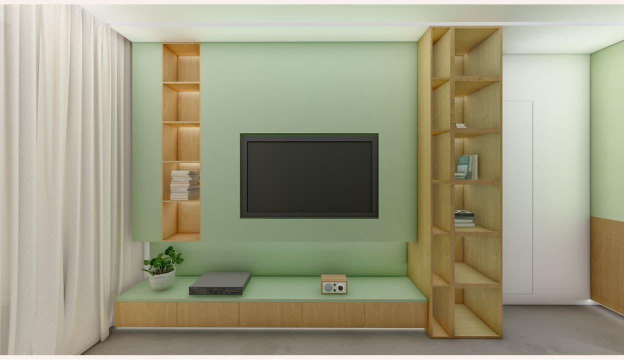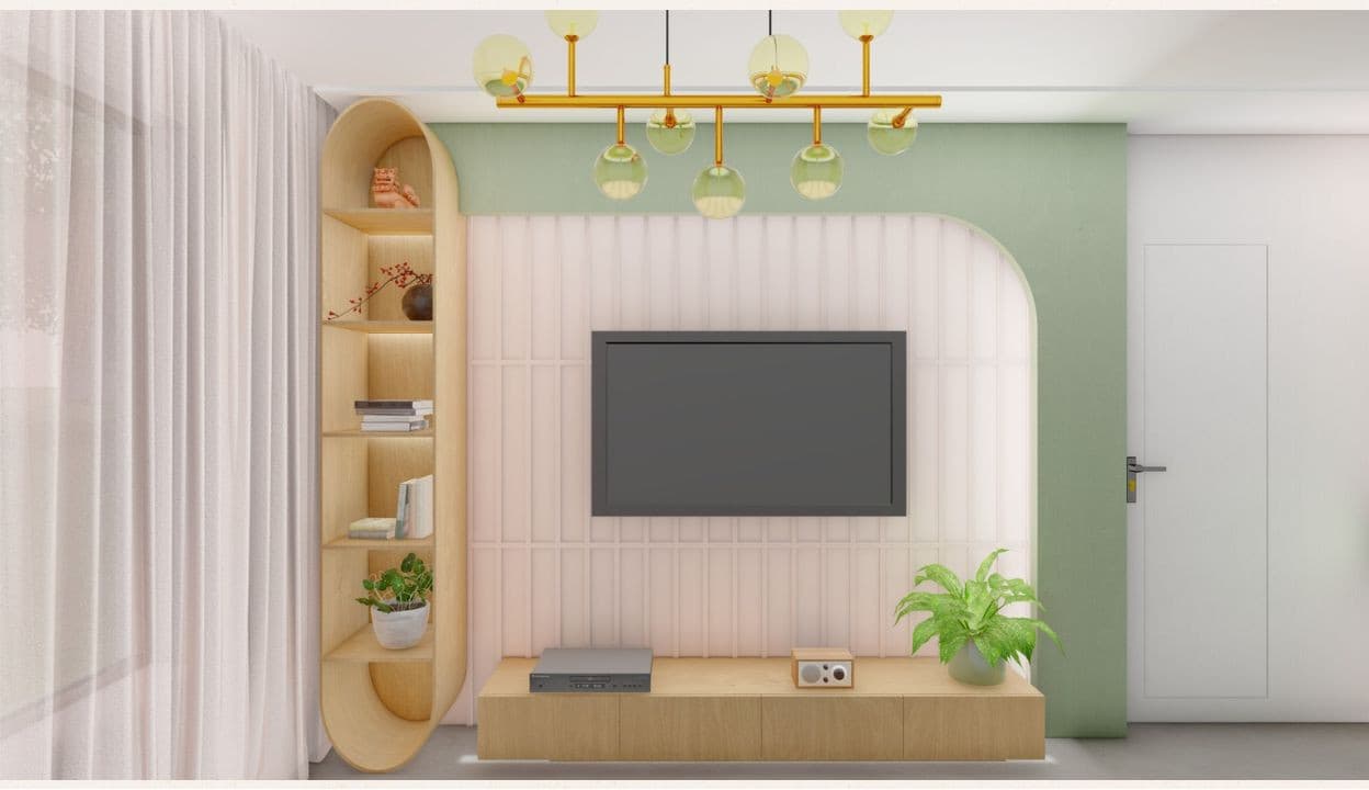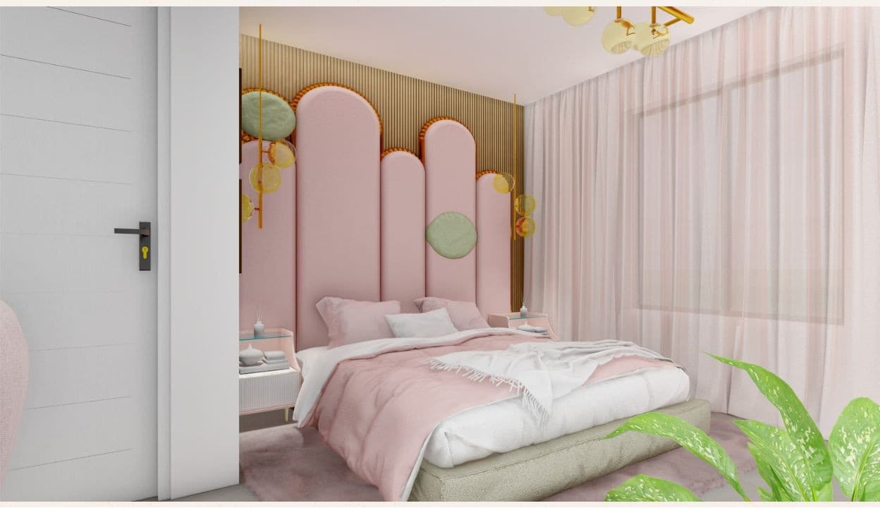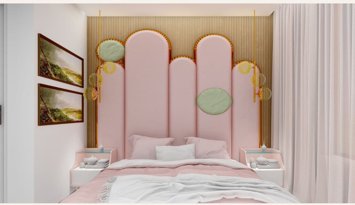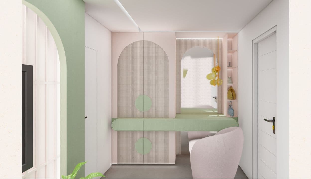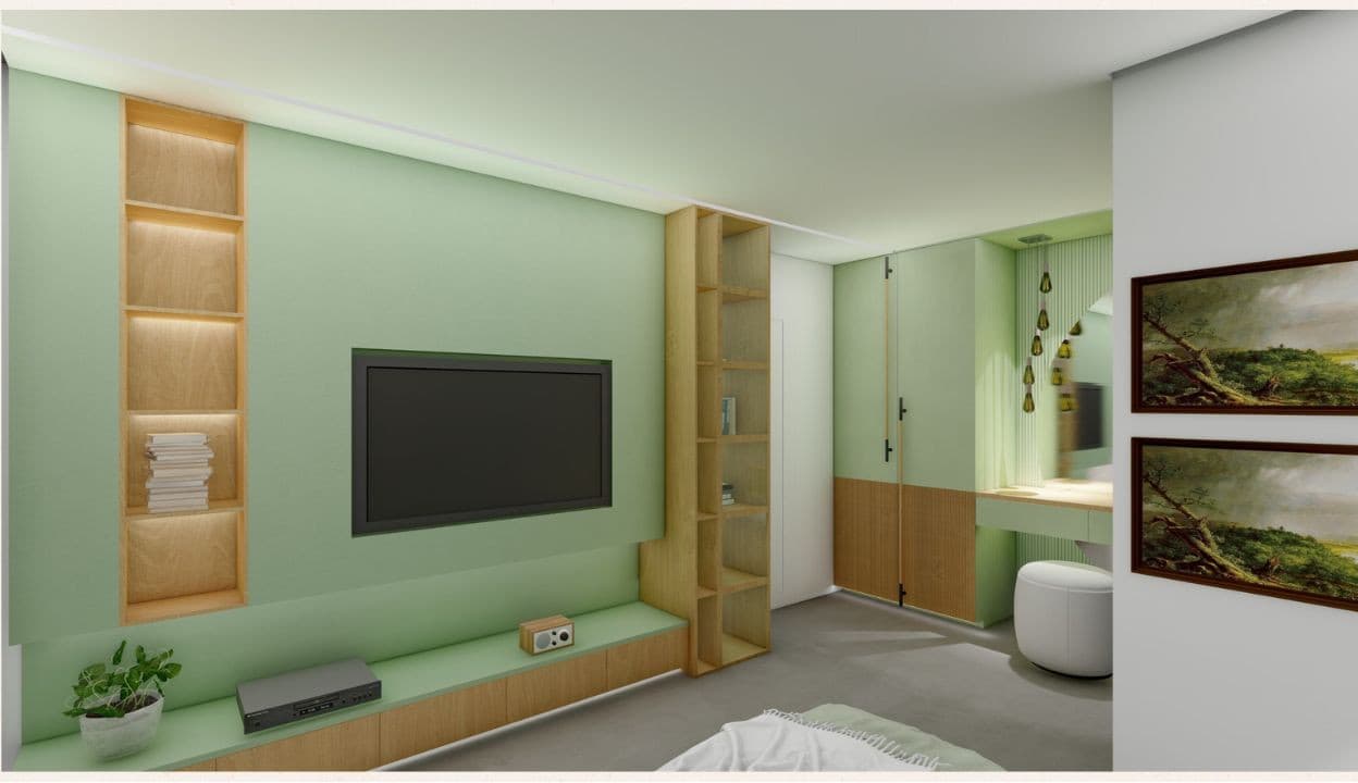 This project features a contemporary bedroom design that combines pastel tones and soft green accents with elegantly curved forms and natural wood textures. The space is enhanced by bespoke furniture, integrated shelving, and functional layouts, creating a harmonious blend of aesthetics and practicality. Key elements include an arched headboard, gold decorative details, layered lighting, and a soothing colour palette, resulting in a warm and inviting ambience that reflects modern sophistication.
