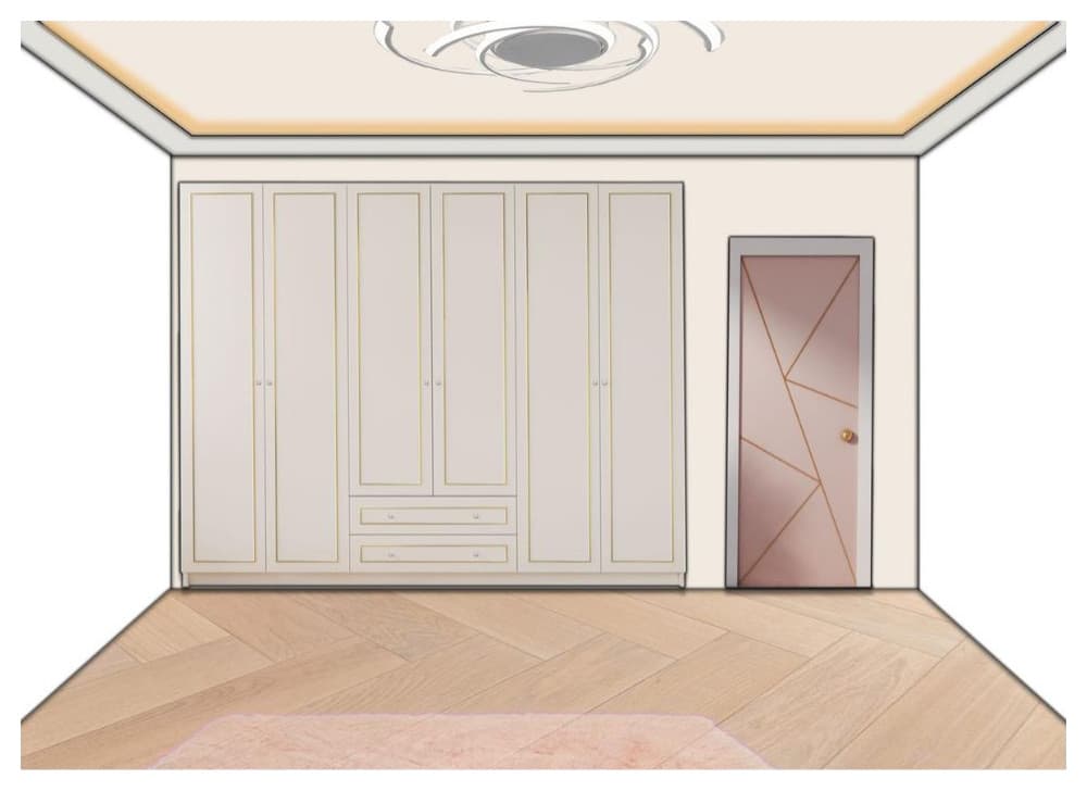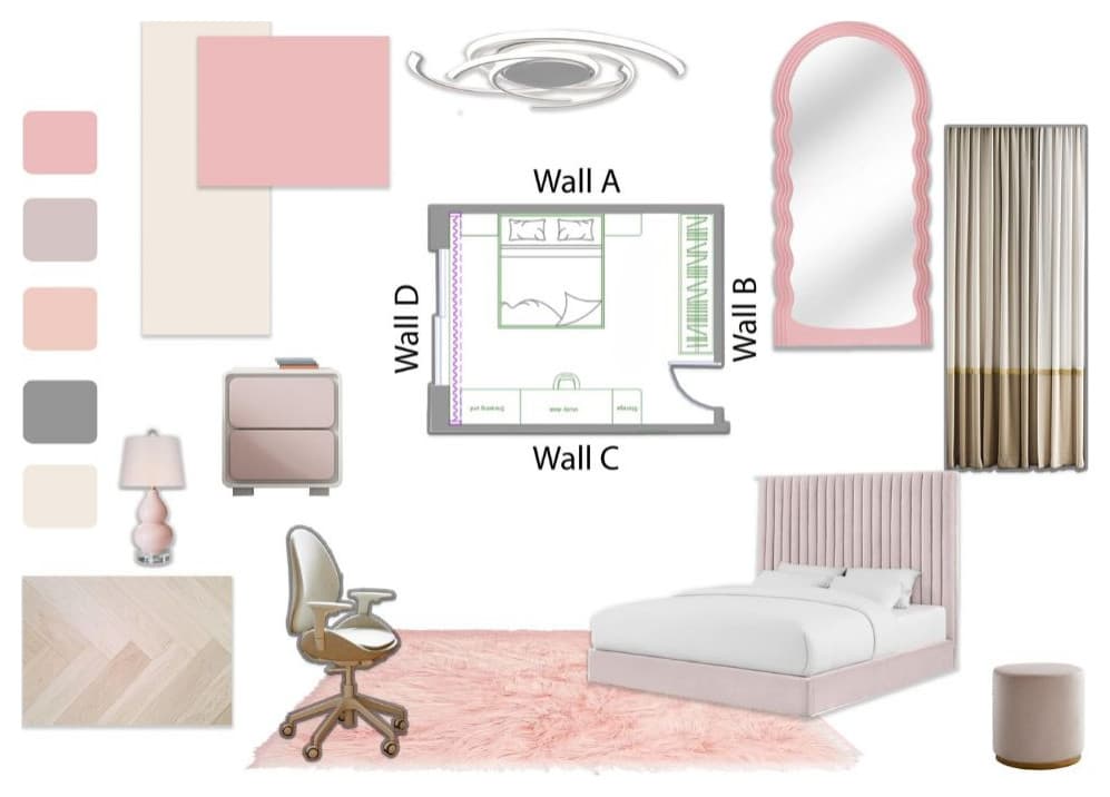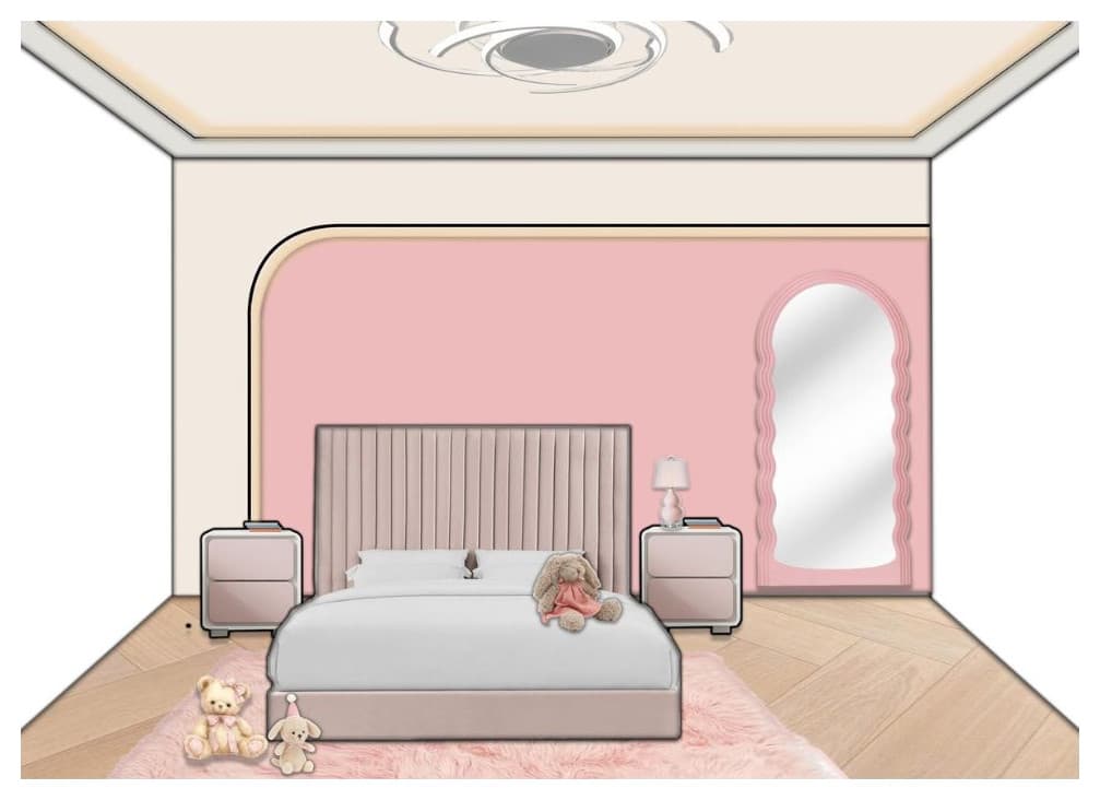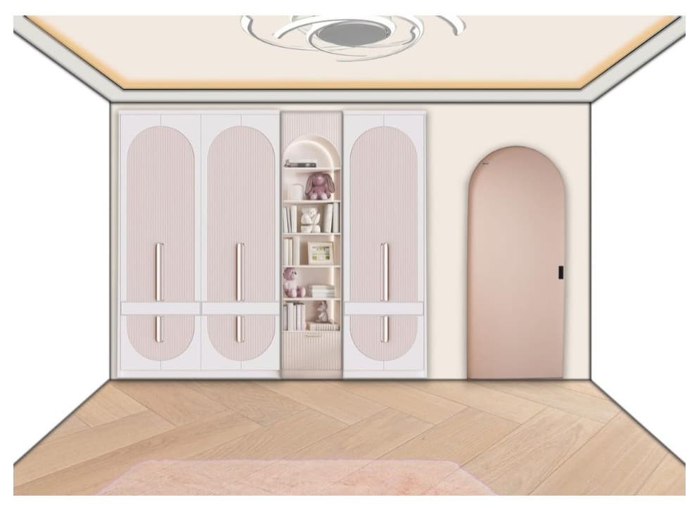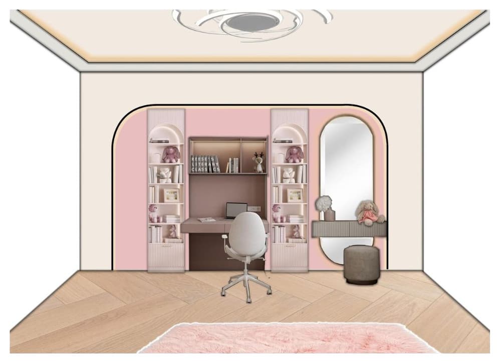 This project features a contemporary bedroom design with a soft, feminine aesthetic, incorporating pastel tones and elegant elements for a serene and functional space. Key highlights include a customised workspace, an arched shelving unit, and bespoke wardrobes, complemented by a plush bed and layered curtains for added comfort. The design emphasises a harmonious colour palette, natural wood flooring, and thoughtful spatial planning to create a cosy yet sophisticated environment that blends style and practicality seamlessly.