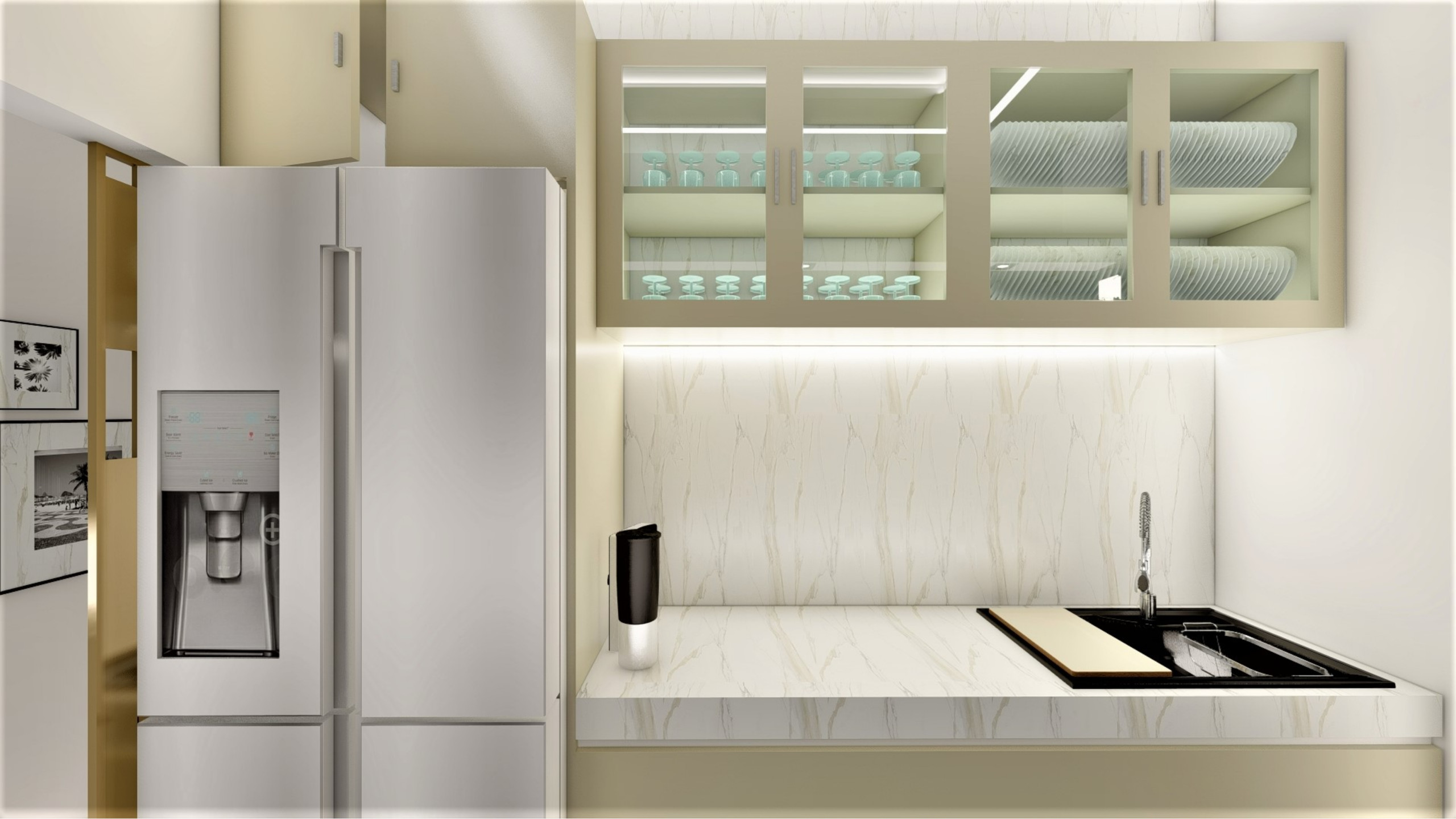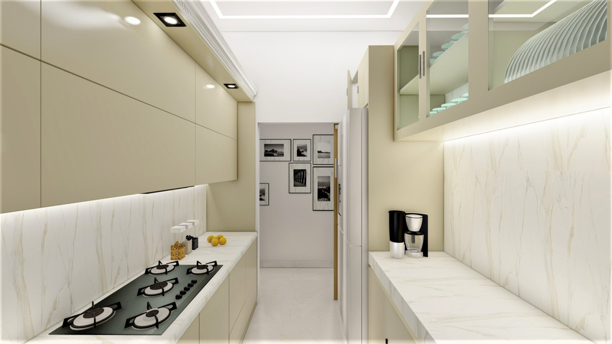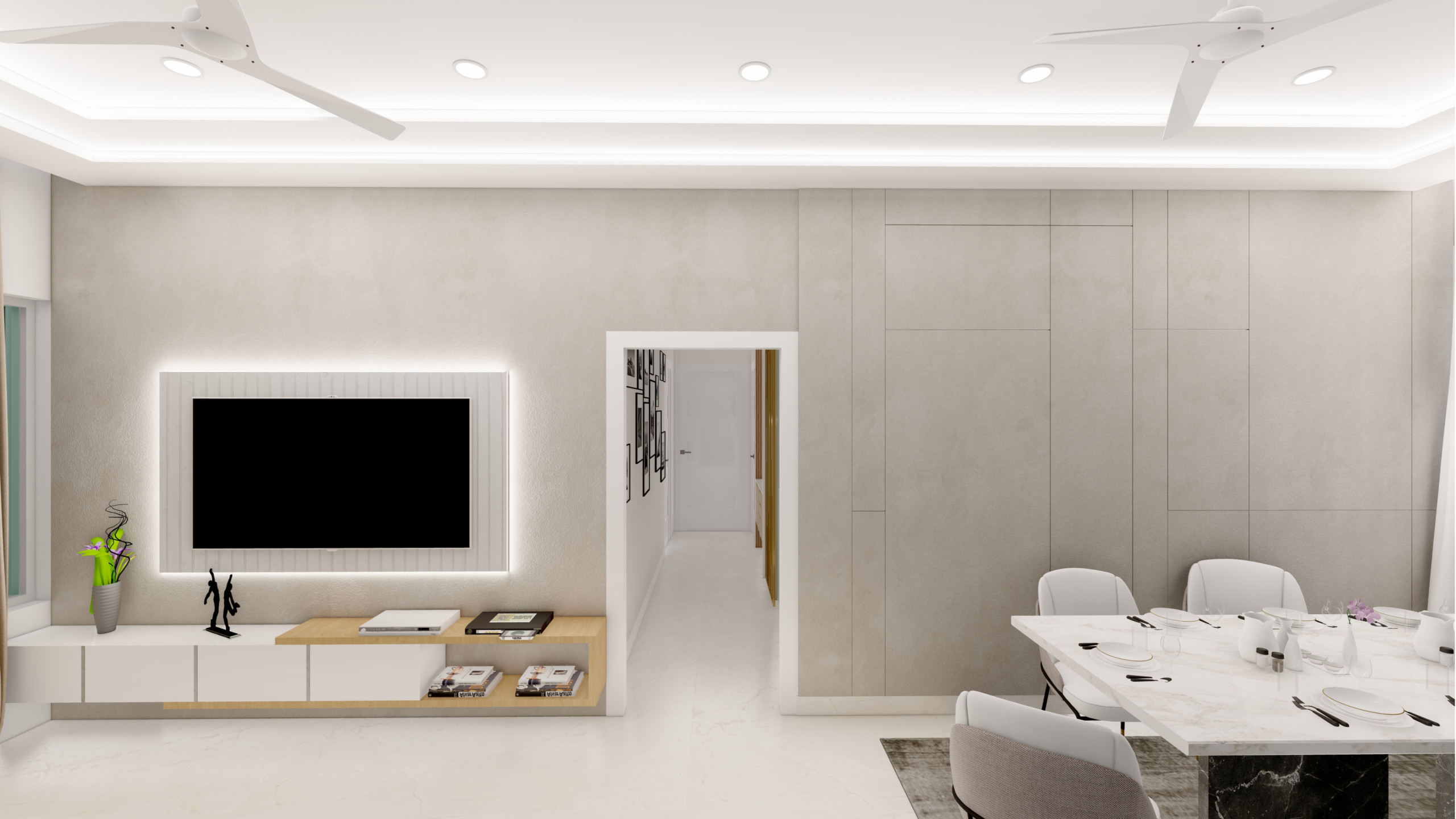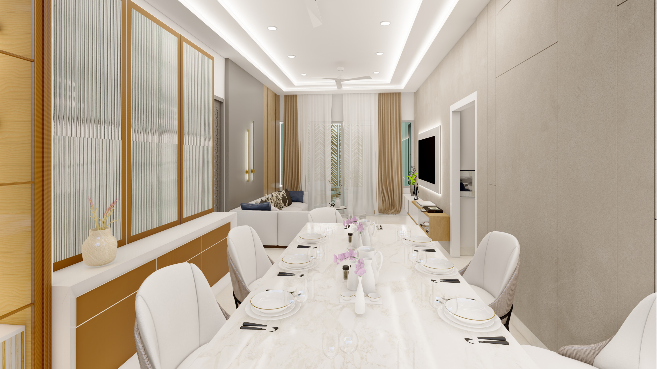 This contemporary open-plan living room and dining area exudes elegance and functionality. The bright and airy space features a stylish kitchen design with sleek cabinetry and modern appliances, seamlessly flowing into the inviting lounge. Warm tones and refined decor create a welcoming atmosphere, perfect for family gatherings or entertaining guests. Natural elements, such as wood accents and greenery, enhance the overall aesthetic, while chic furniture arrangements ensure a comfortable and sophisticated environment. The harmonious layout promotes easy interaction between the living and dining spaces, making this home an ideal blend of contemporary style and practicality.