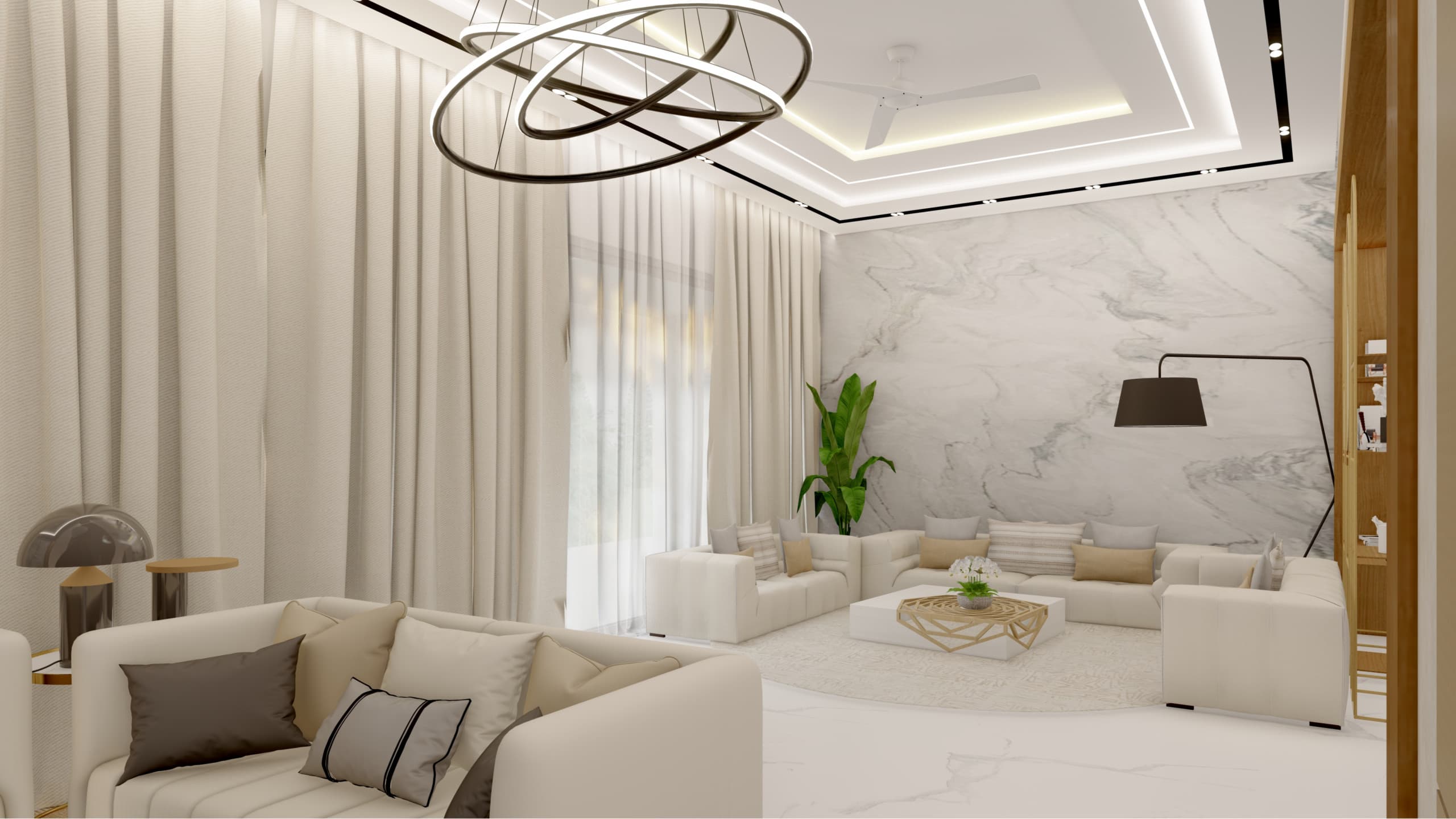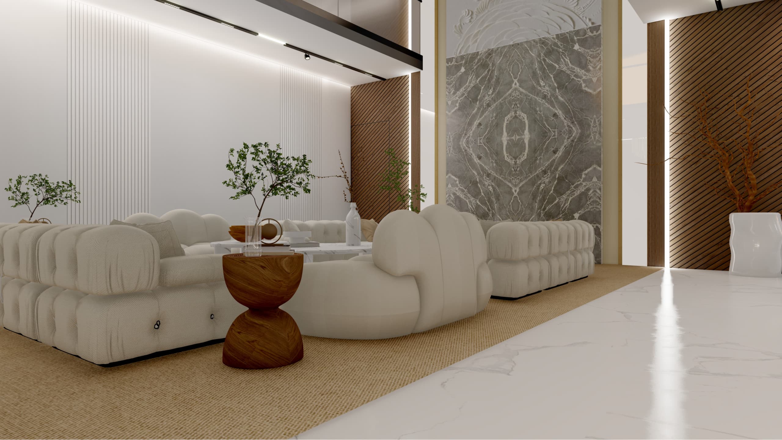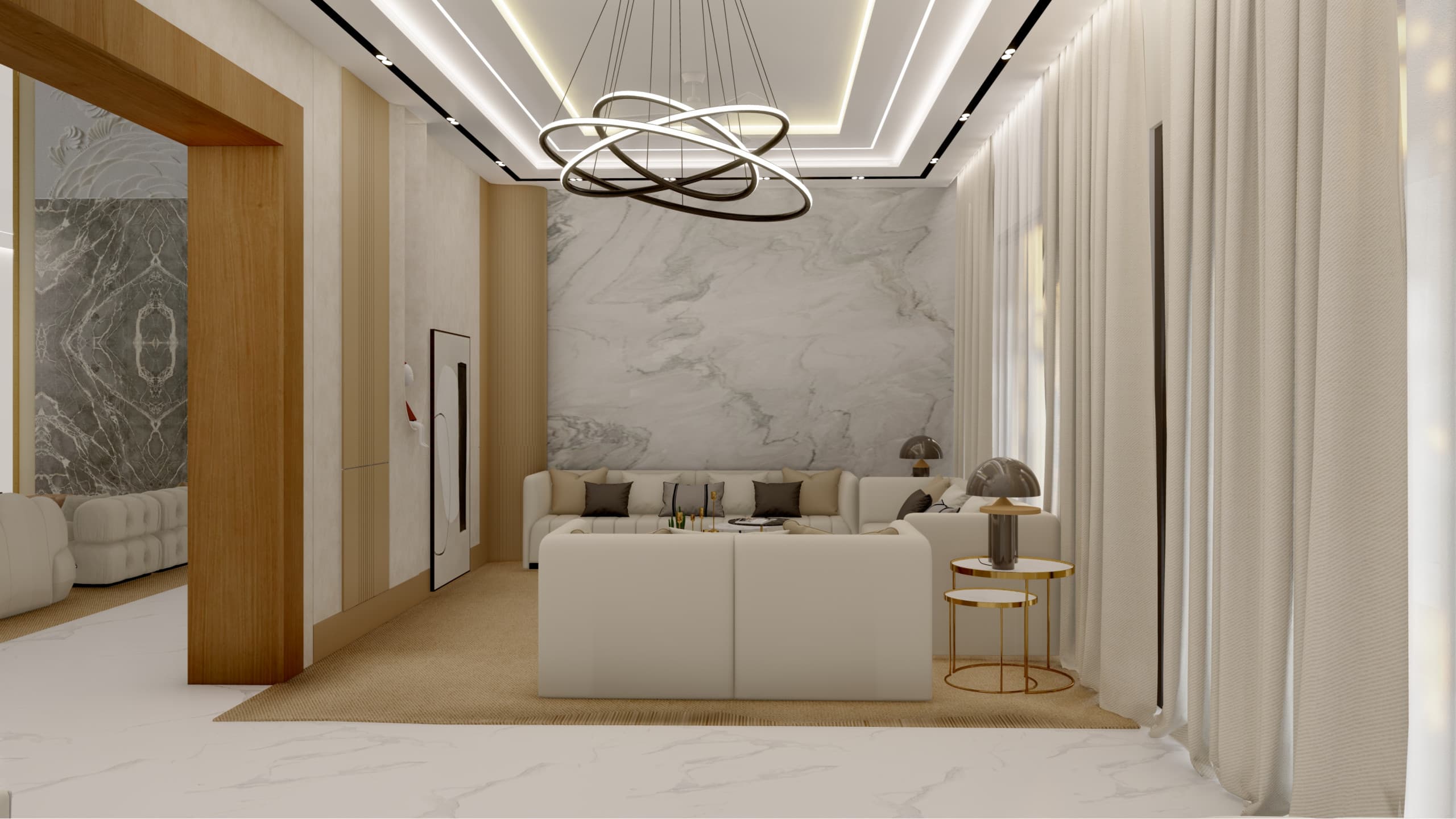 This luxurious contemporary living room features a soft palette of cream and light colours, creating a refined and airy atmosphere. Marble accents throughout the space add a touch of elegance and modern luxury, enhancing the sleek design. The neutral tones and minimalist decor give the room a timeless appeal, with subtle sophistication and understated elegance. The harmonious blend of light hues and refined materials makes this living space both chic and inviting, perfect for relaxing or entertaining.