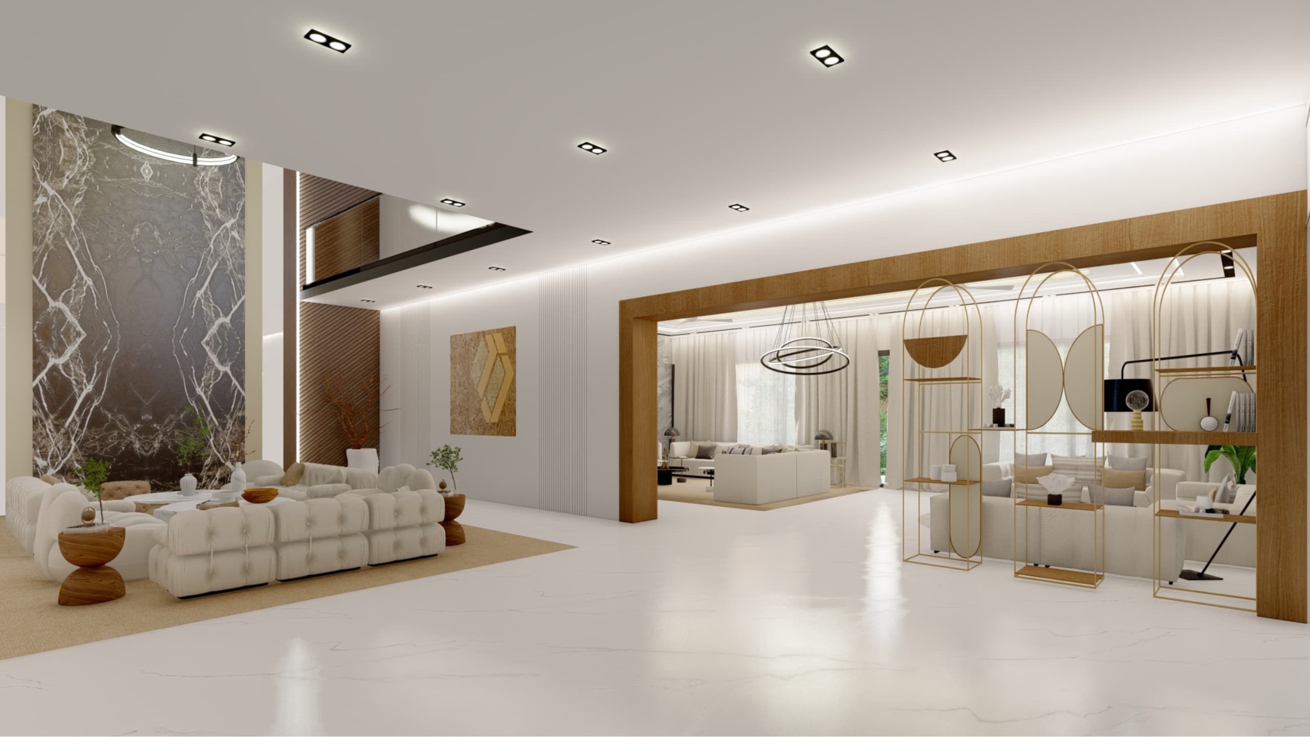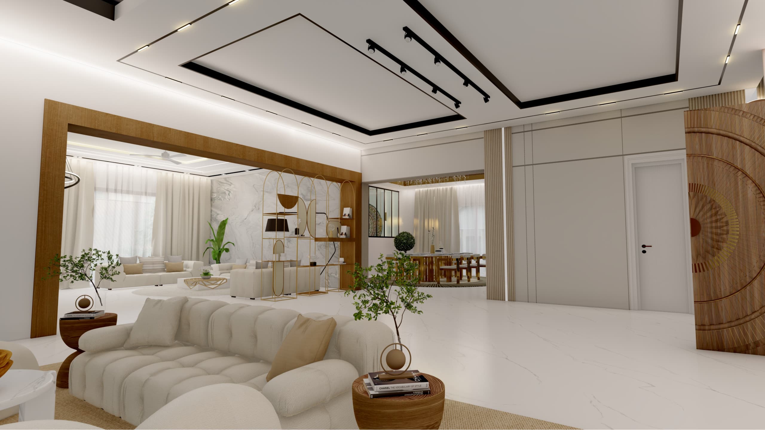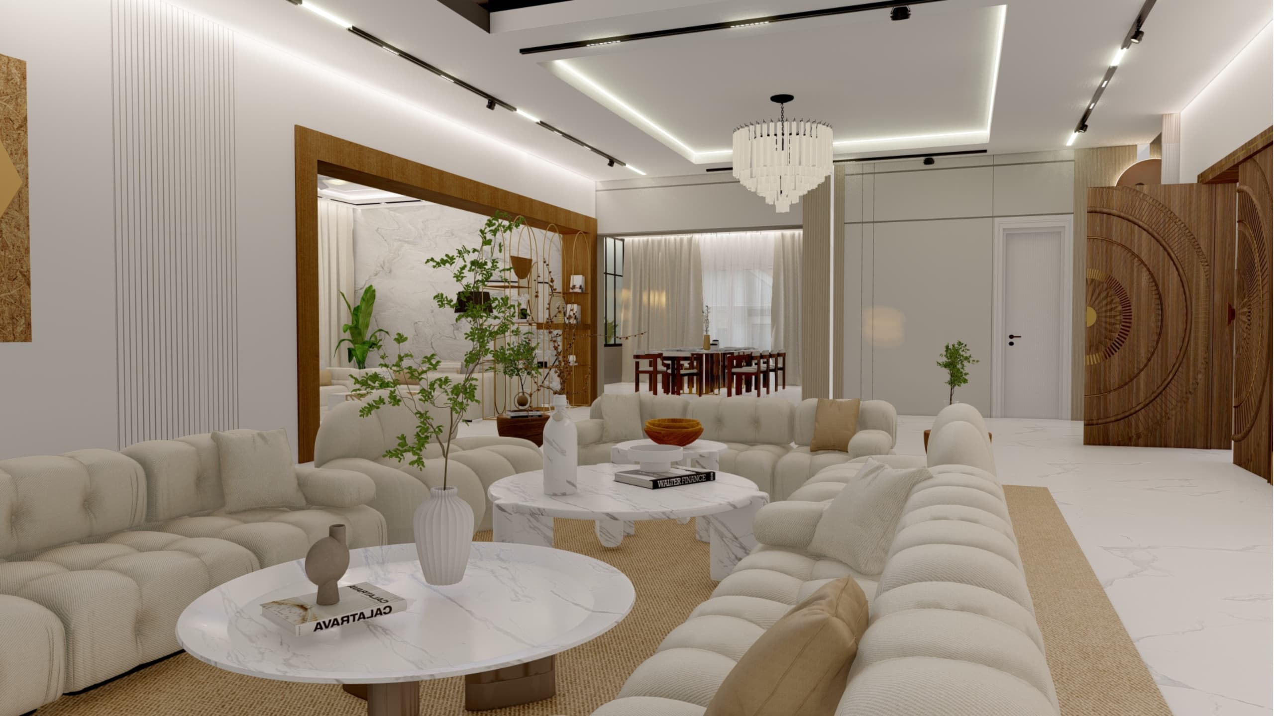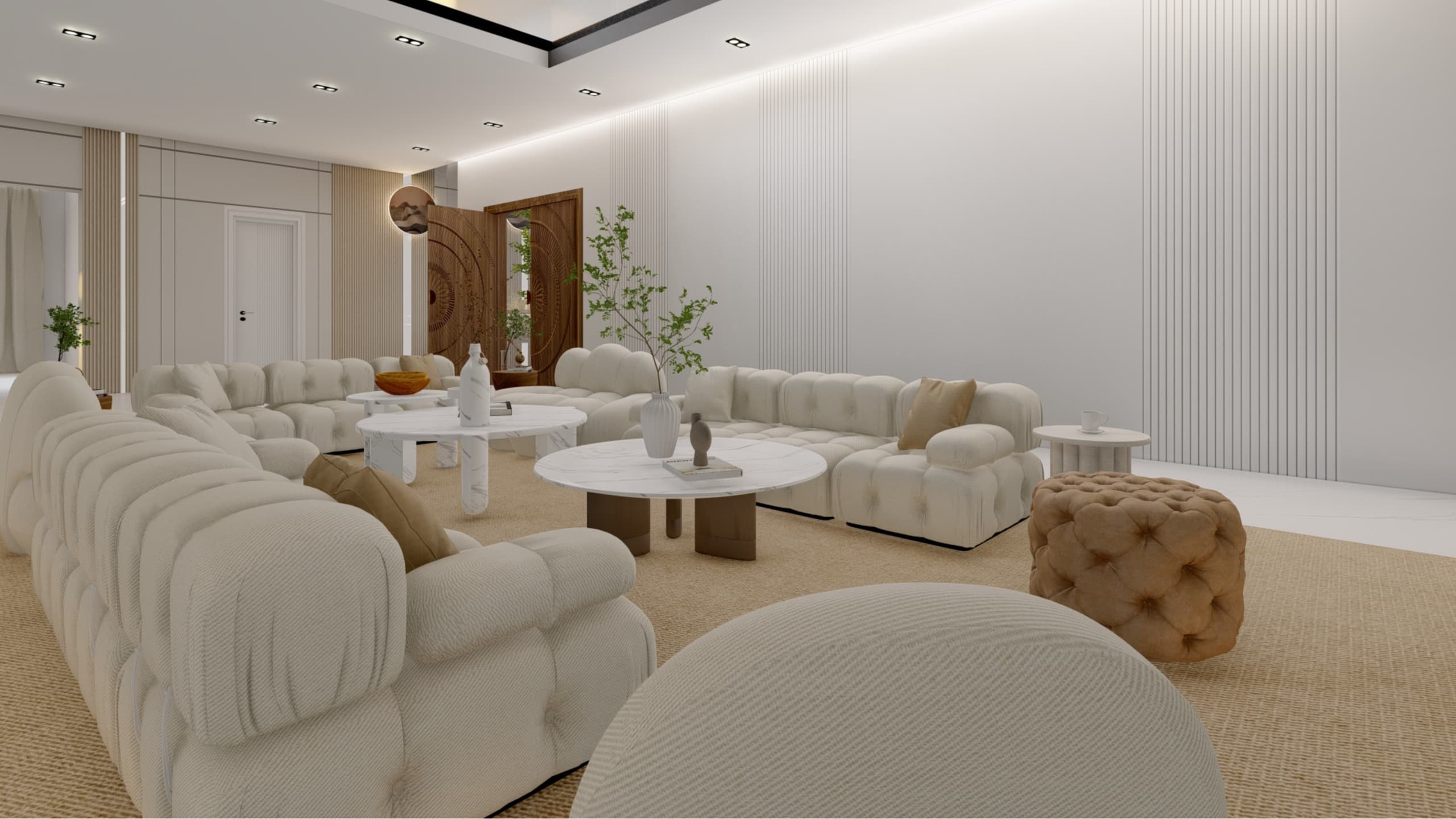 This luxurious contemporary living room features a soft palette of cream and light colours, creating a refined and airy atmosphere. Marble accents throughout the space add a touch of elegance and modern luxury, enhancing the sleek design. The neutral tones and minimalist decor give the room a timeless appeal, with subtle sophistication and understated elegance. The harmonious blend of light hues and refined materials makes this living space both chic and inviting, perfect for relaxing or entertaining.