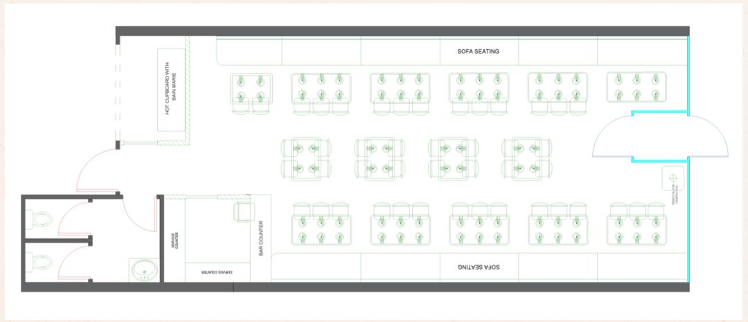 The layout is carefully organised to balance customer comfort with smooth staff circulation, clearly defining dining zones, service areas, and ordering counters. Integrated lighting highlights key focal points and enhances the overall ambience during both day and evening service.