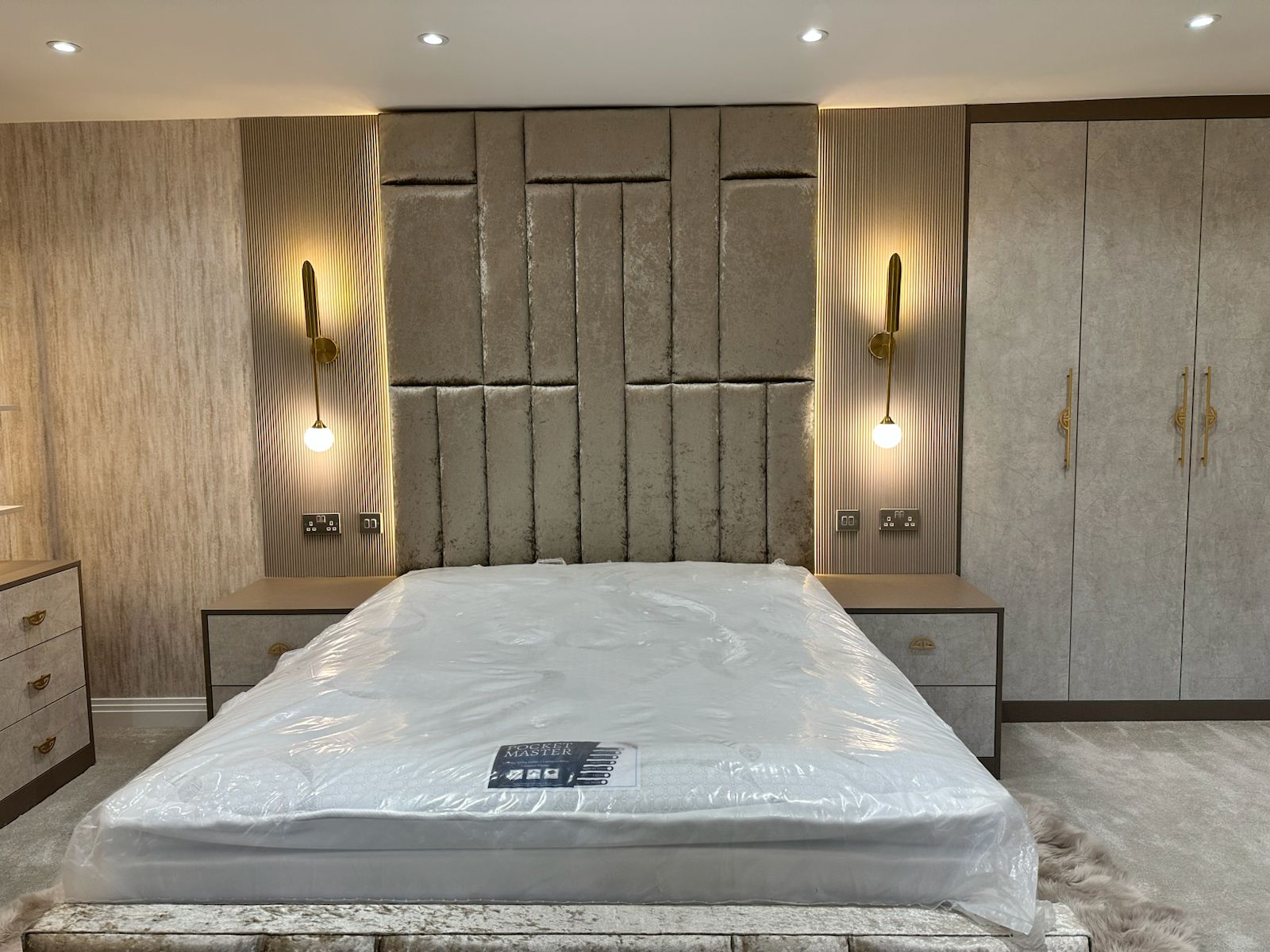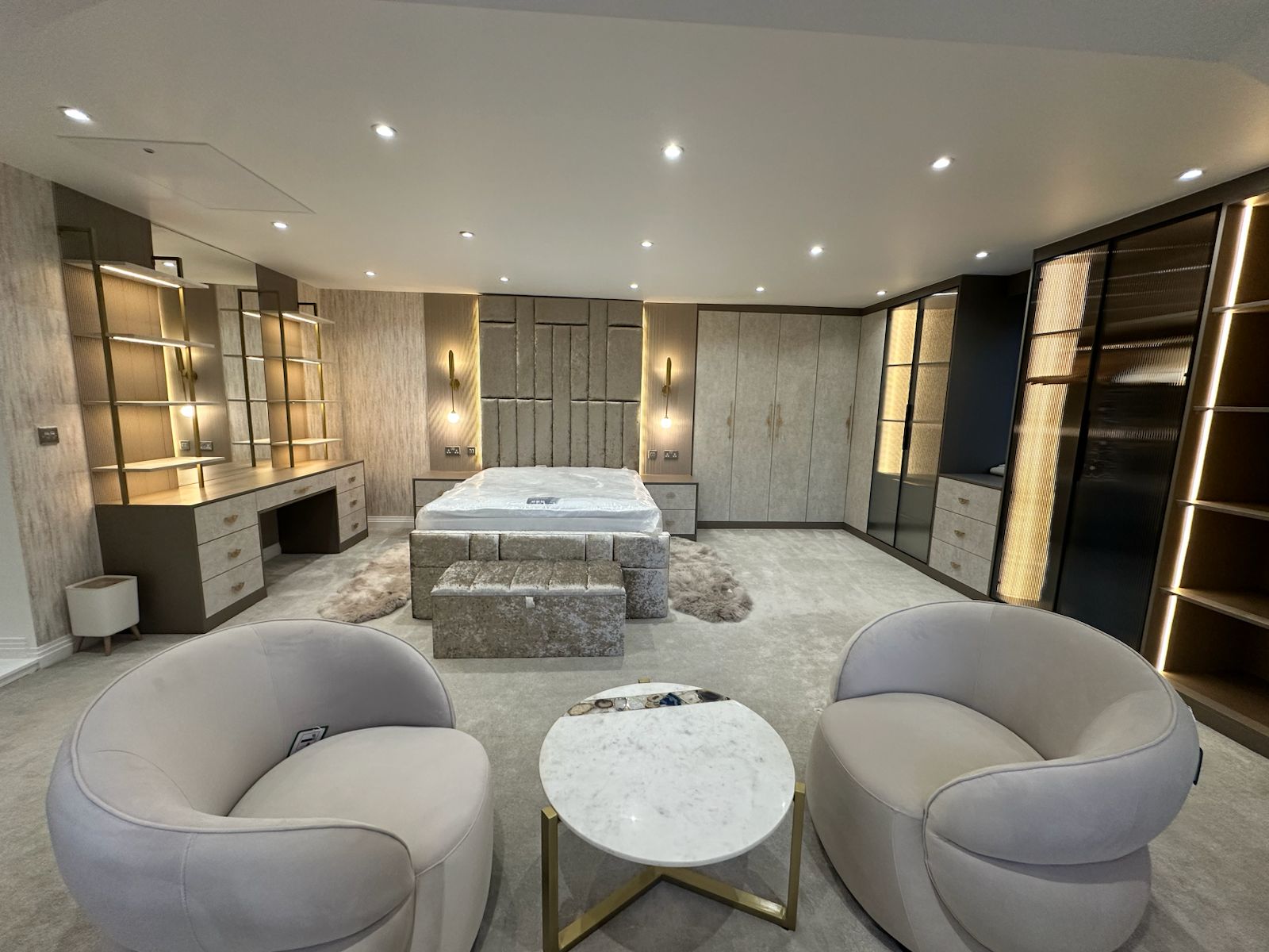 This master bedroom suite has been transformed into a refined, hotel-style retreat featuring fully bespoke joinery, ambient lighting, and a warm, sophisticated palette. The space includes custom-built wardrobes with integrated LED lighting, a tailored dressing area, and a statement headboard wall designed to create depth and symmetry. Soft, textured finishes elevate the room, while coordinated furniture pieces and subtle metallic accents bring harmony and elegance throughout the suite. Every detail—from storage planning to final styling—has been thoughtfully curated to achieve a luxurious, cohesive environment that blends comfort, practicality, and timeless design.