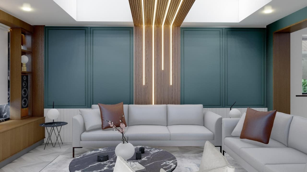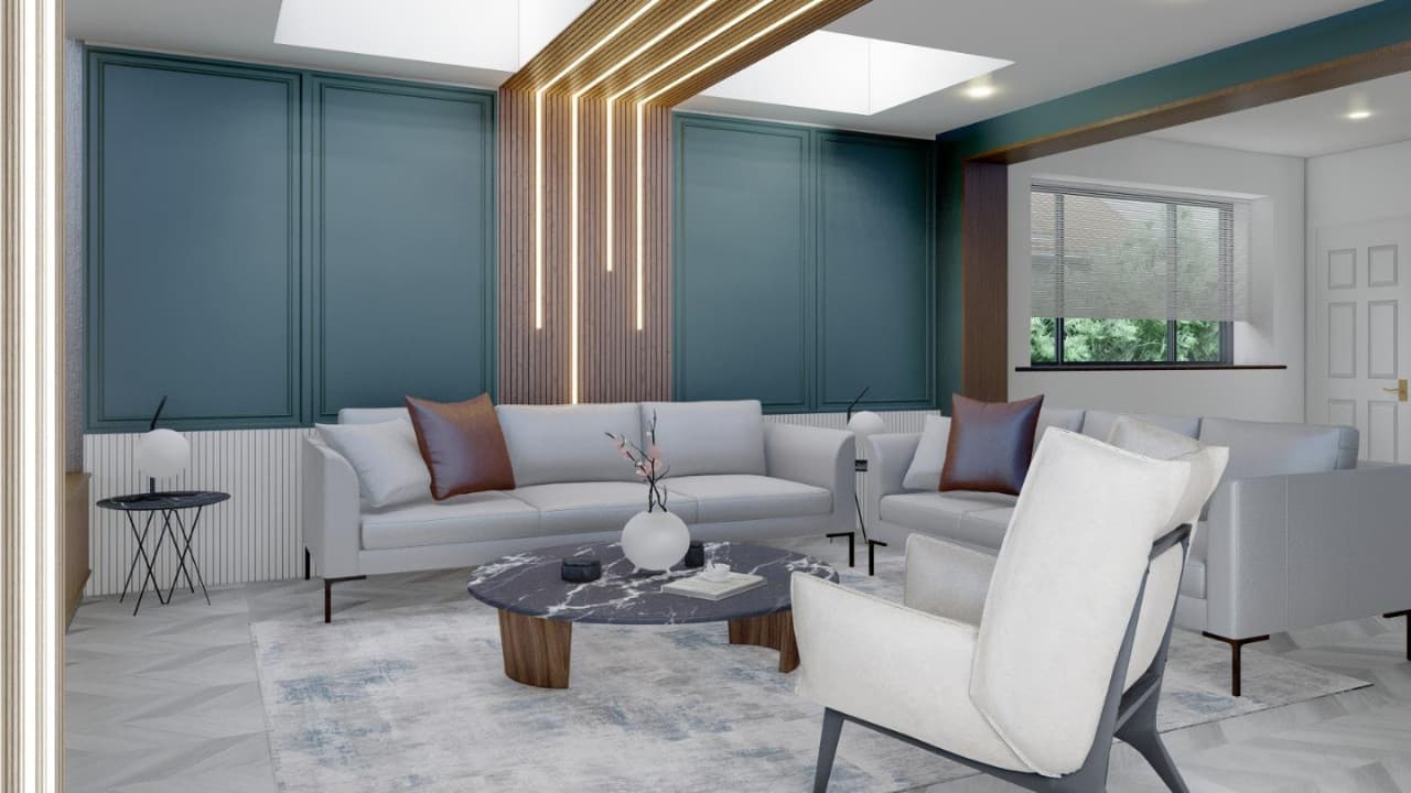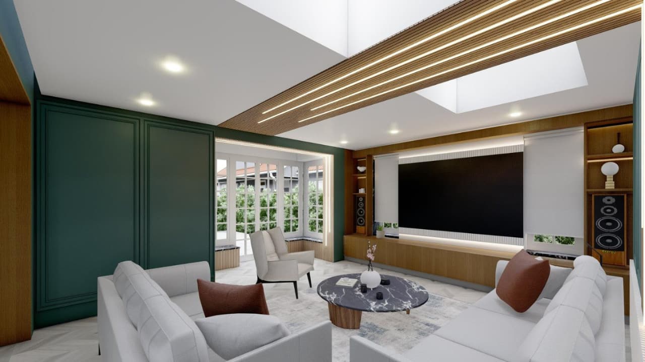 The cinema room is the perfect blend of modern cinema room design and contemporary home theatre aesthetics. With sleek audio systems and an immersive sound experience, this space is a haven for movie lovers. The custom-built media room features minimalist seating with luxury recliner chairs, perfect for comfort and style. Smart technology comes into play with smart lighting systems and LED mood lighting, adding ambience and a cinematic feel. The surround sound setup, along with acoustic wall panels, ensures superior sound quality, while the projector setup and large screen installation deliver a theatre-like experience. Designed with integrated storage solutions and an open space design, this contemporary media room is a sleek and high-tech entertainment hub.