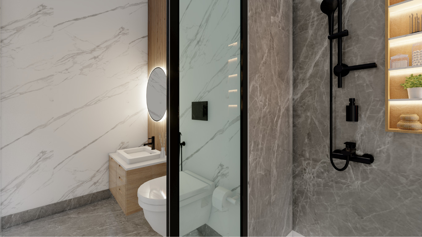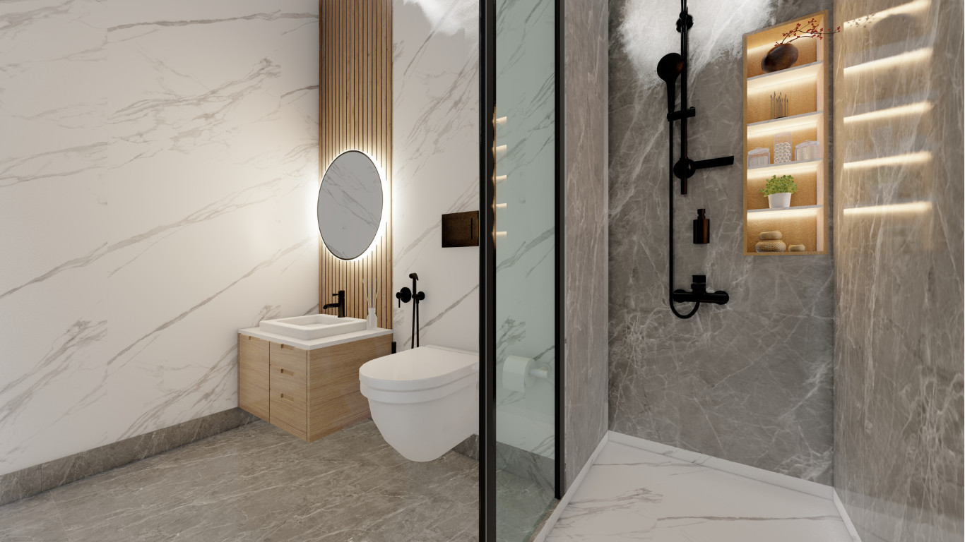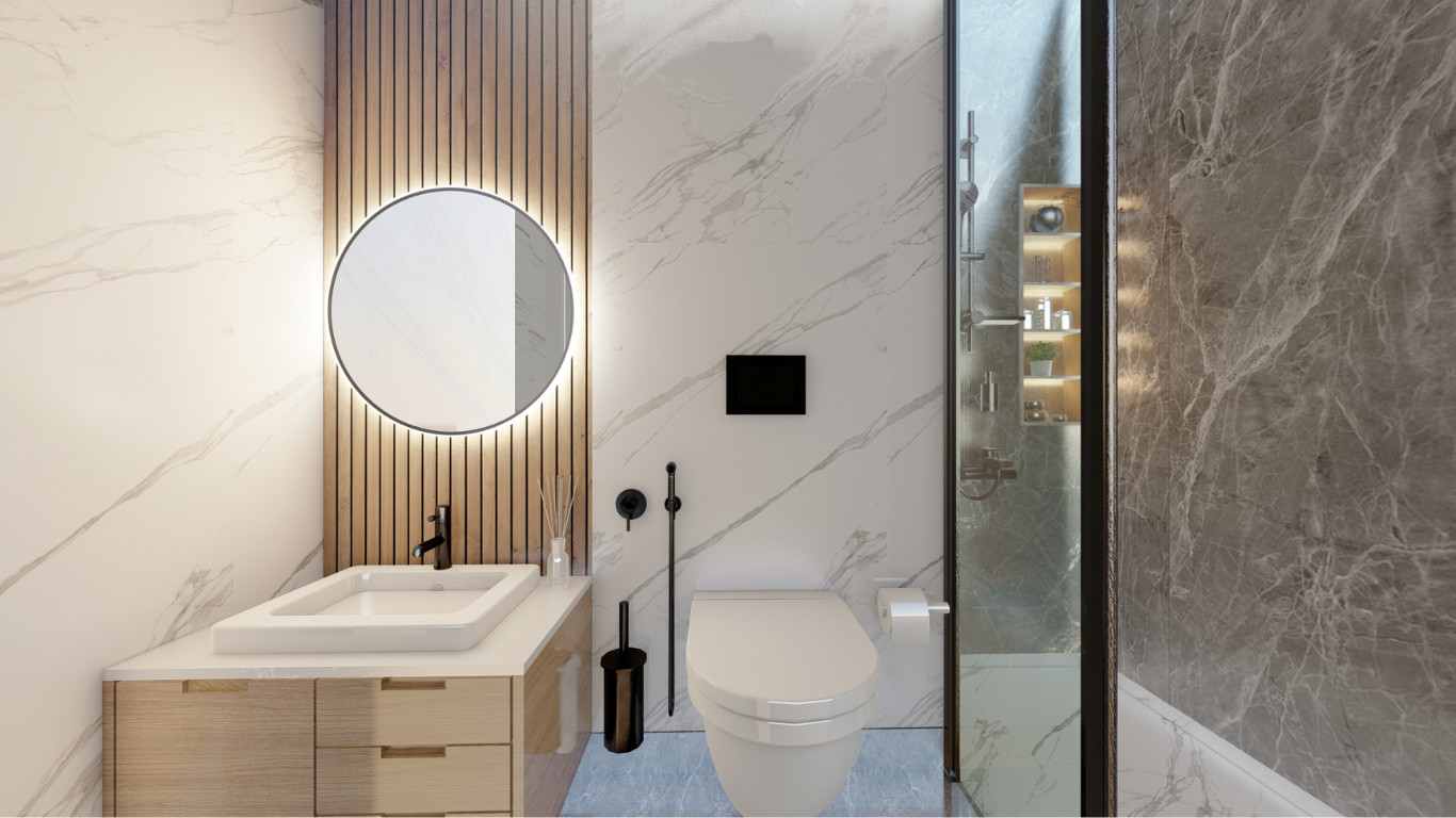 The Minimal Bathroom Renovation in Barking showcases a sleek and modern design, blending functionality with elegance. Featuring clean marble-effect walls, a backlit circular mirror, and streamlined fixtures in matte black, the space exudes contemporary sophistication. Warm wooden cabinetry adds a touch of natural charm, while the frameless glass shower ensures an open and airy feel, making this bathroom both stylish and practical.
