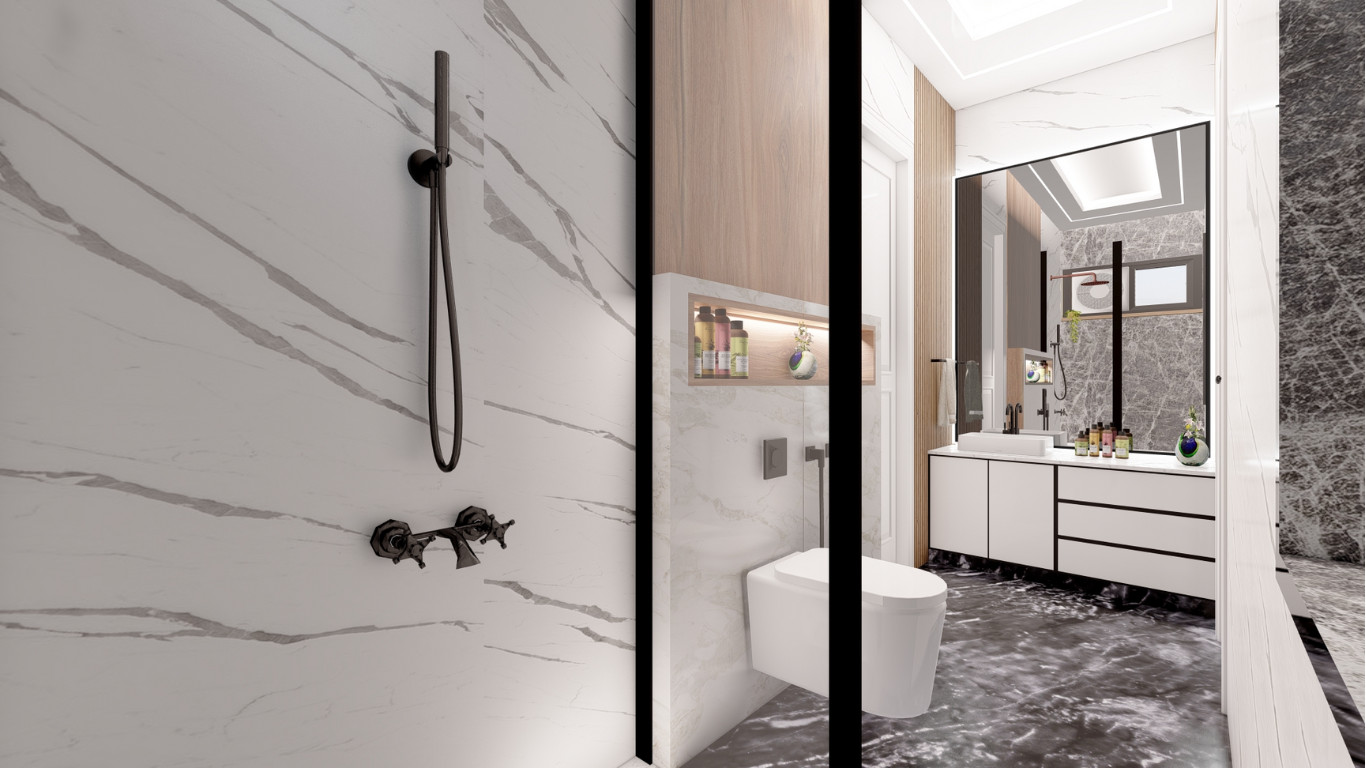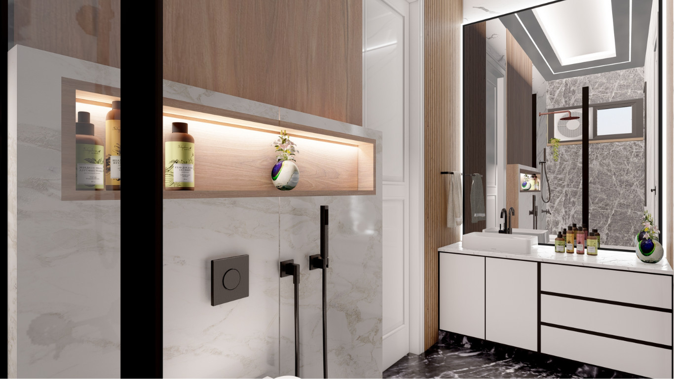 Sleek design combined with functional luxury for modern bathroom remodels. Add minimalist fixtures—a free-standing tub and walk-in shower—for an open feeling in the bathroom. A floating vanity with large mirrors makes more room, while smart lighting provides a touch of convenience. Glass shower doors and marble countertops add to the sophistication, and the matte black fixtures provide a striking contrast. Comfort in heated flooring was added with luxury tiles to make your bathroom retreat in style.