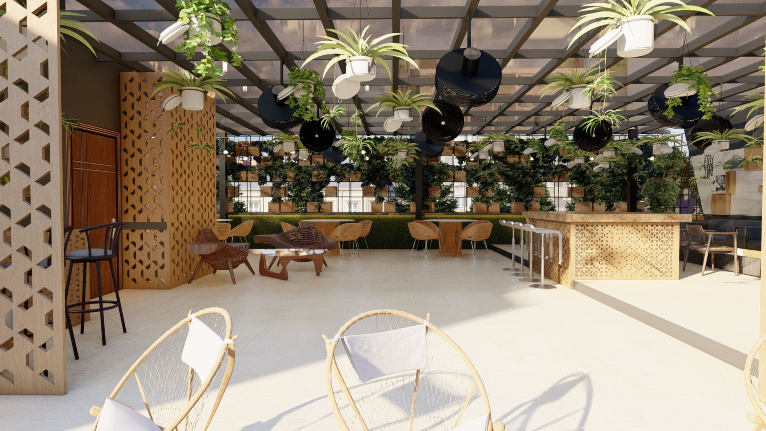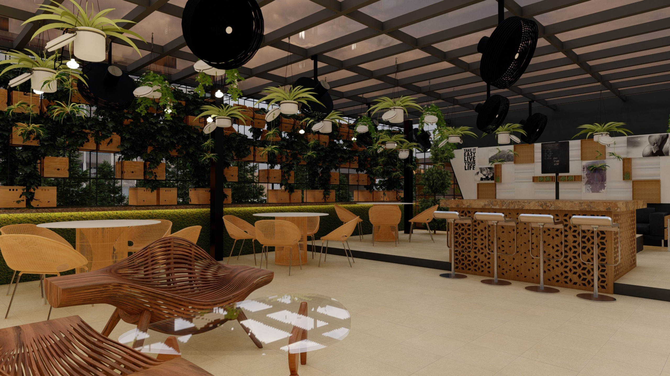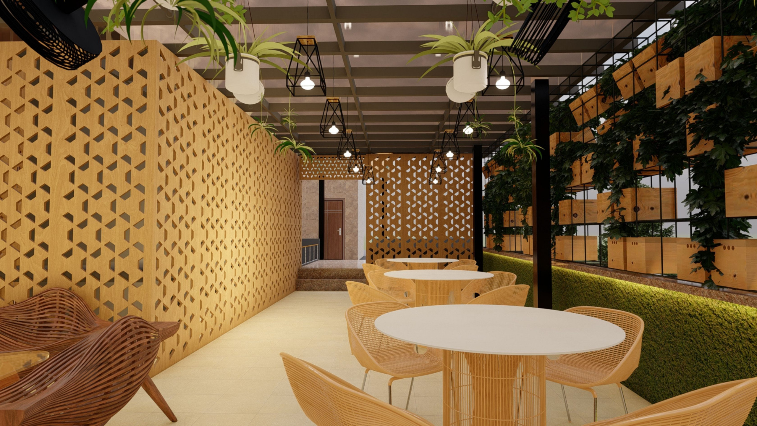 This project is a captivating blend of modern design and organic aesthetics, offering a serene dining experience amidst lush greenery. The interior features an open layout adorned with natural textures, wooden furniture, and intricate lattice panels, creating a seamless connection between indoor and outdoor elements. Hanging plants, warm lighting, and neutral tones enhance the tranquil ambience, making it a perfect retreat from the bustling city. Designed to prioritize sustainability and comfort, this restaurant harmoniously balances contemporary style with nature-inspired decor, providing a unique and inviting space for guests to unwind and enjoy.
