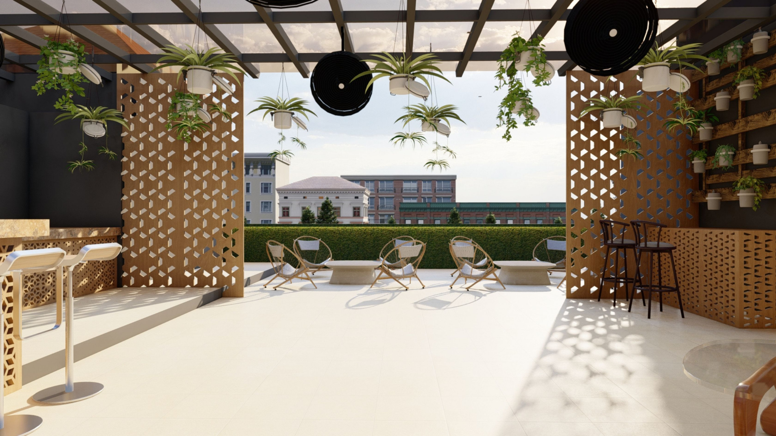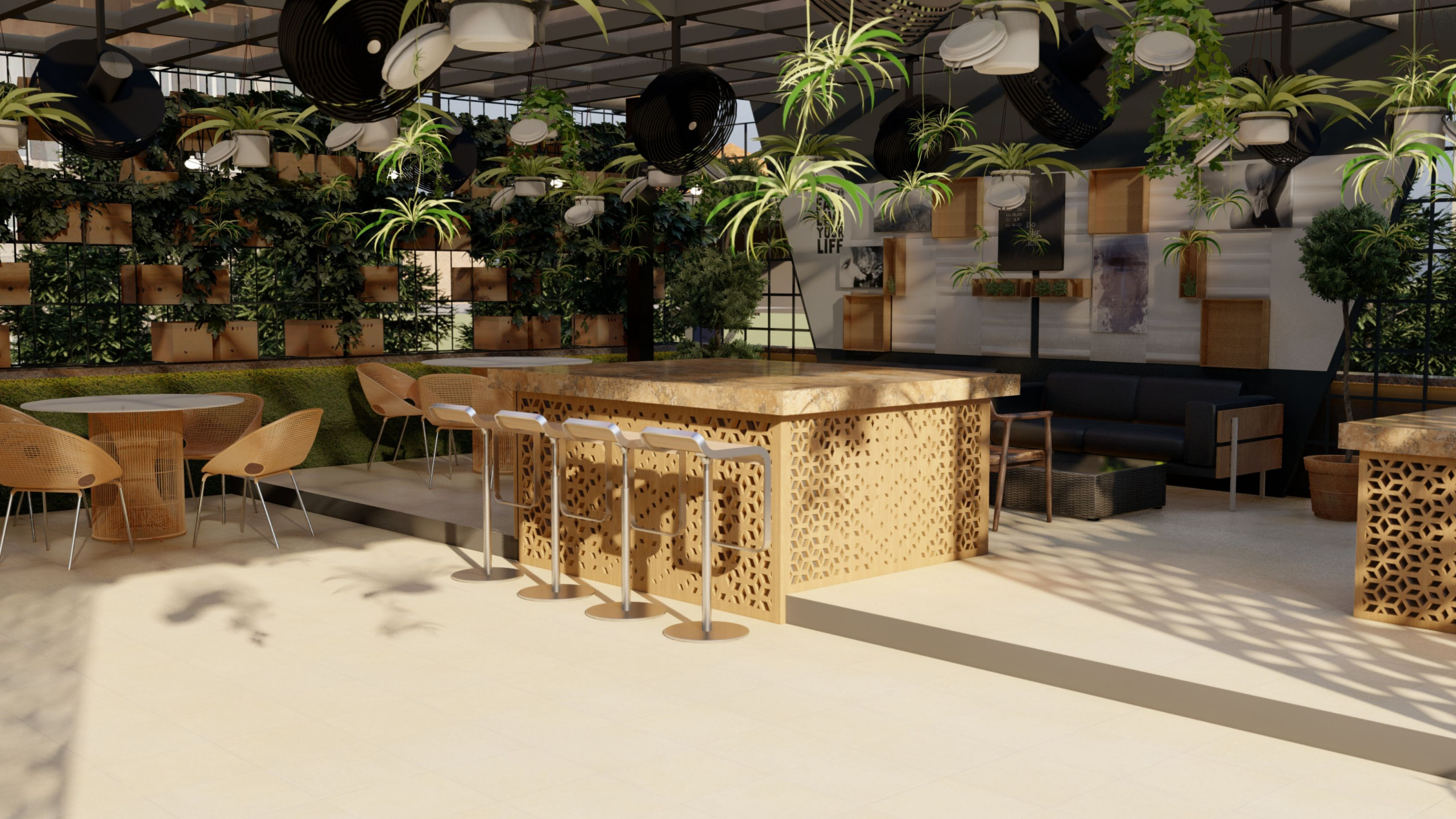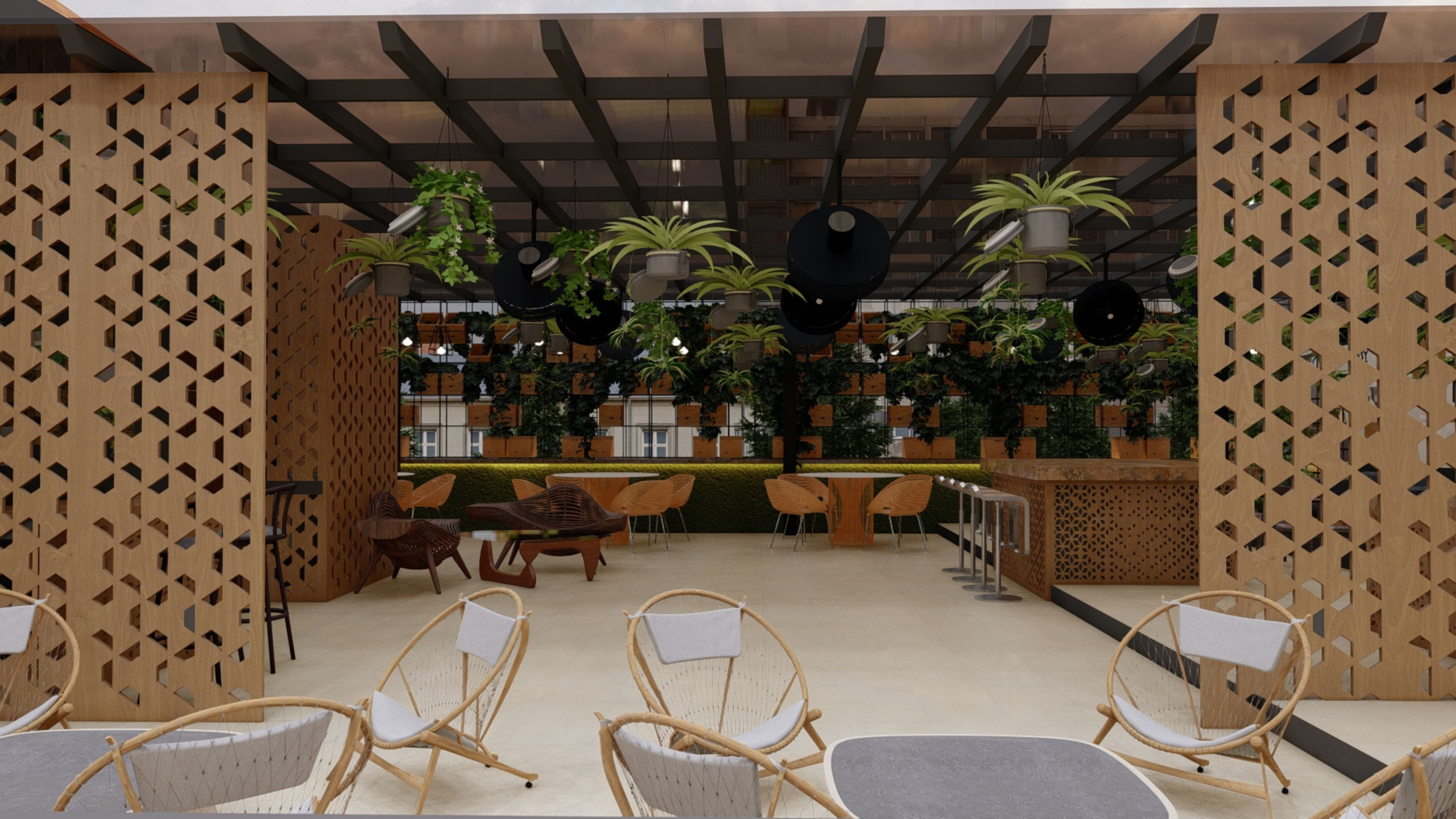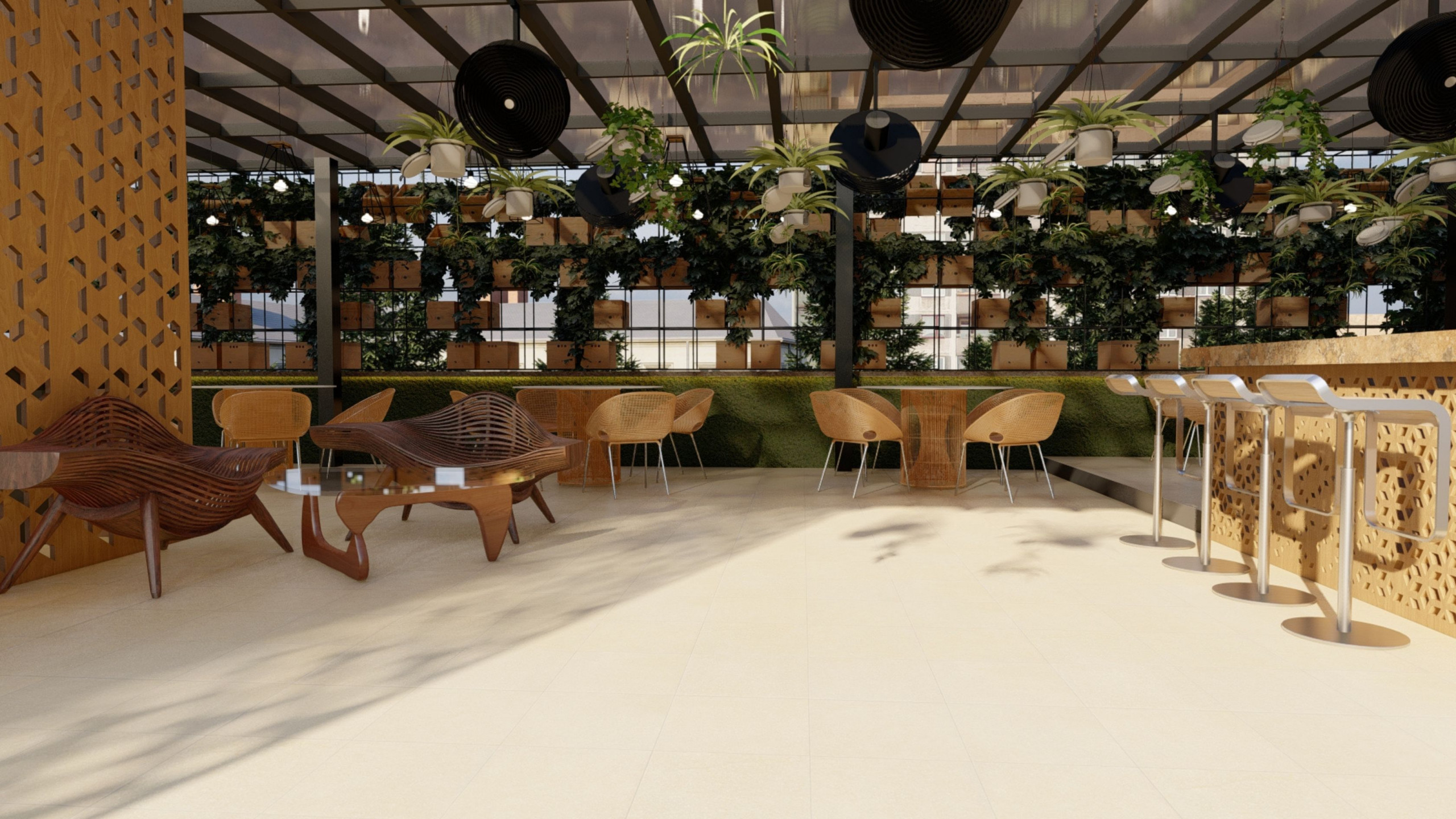 This project is a captivating blend of modern design and organic aesthetics, offering a serene dining experience amidst lush greenery. The interior features an open layout adorned with natural textures, wooden furniture, and intricate lattice panels, creating a seamless connection between indoor and outdoor elements. Hanging plants, warm lighting, and neutral tones enhance the tranquil ambience, making it a perfect retreat from the bustling city. Designed to prioritize sustainability and comfort, this restaurant harmoniously balances contemporary style with nature-inspired decor, providing a unique and inviting space for guests to unwind and enjoy.
