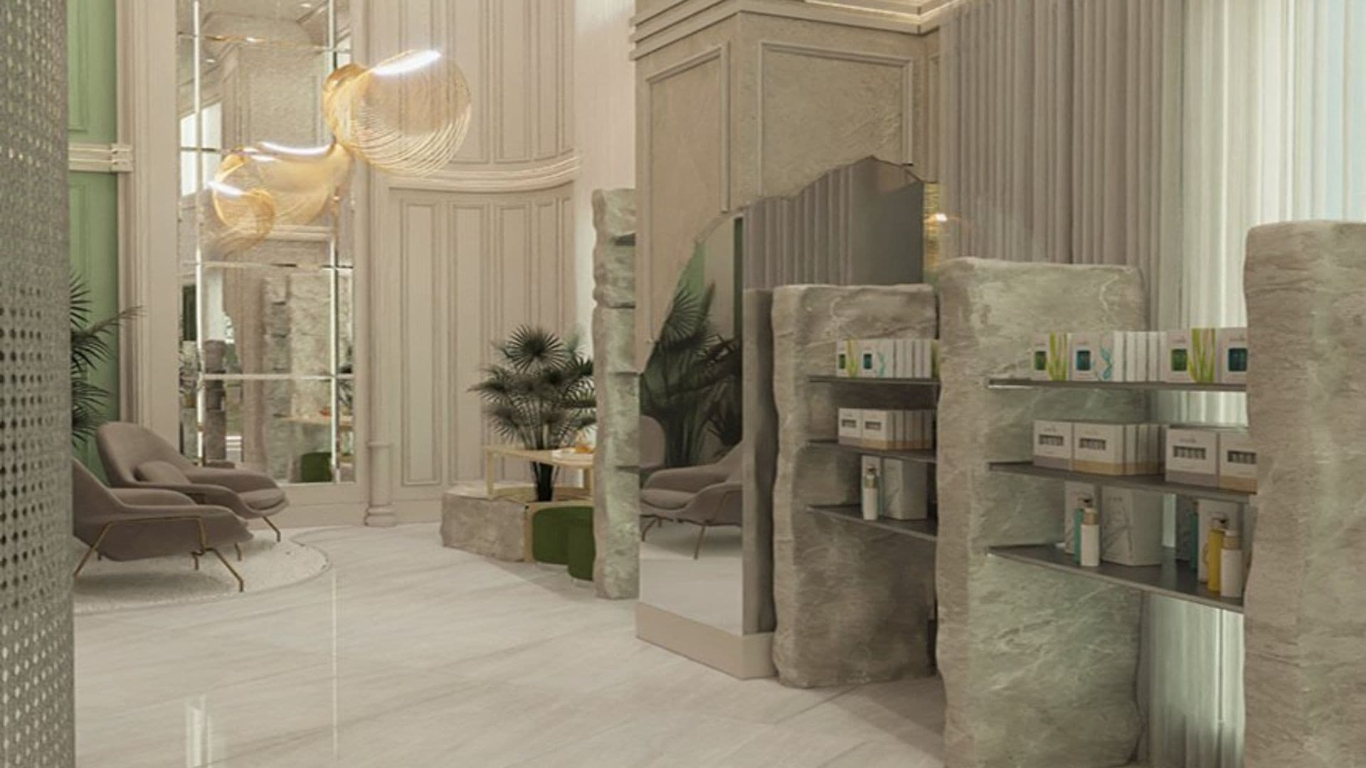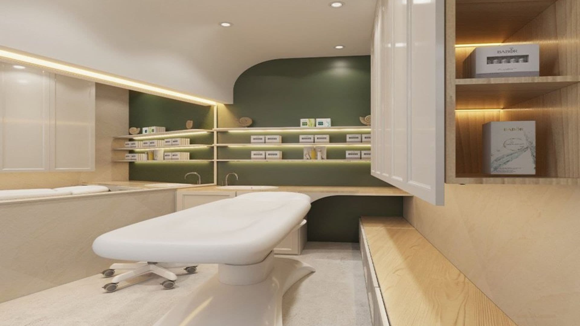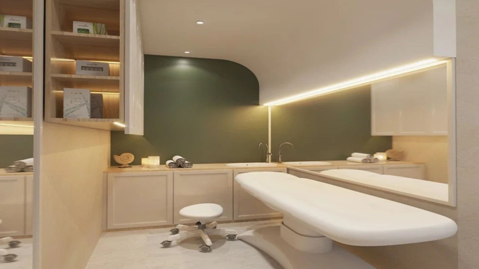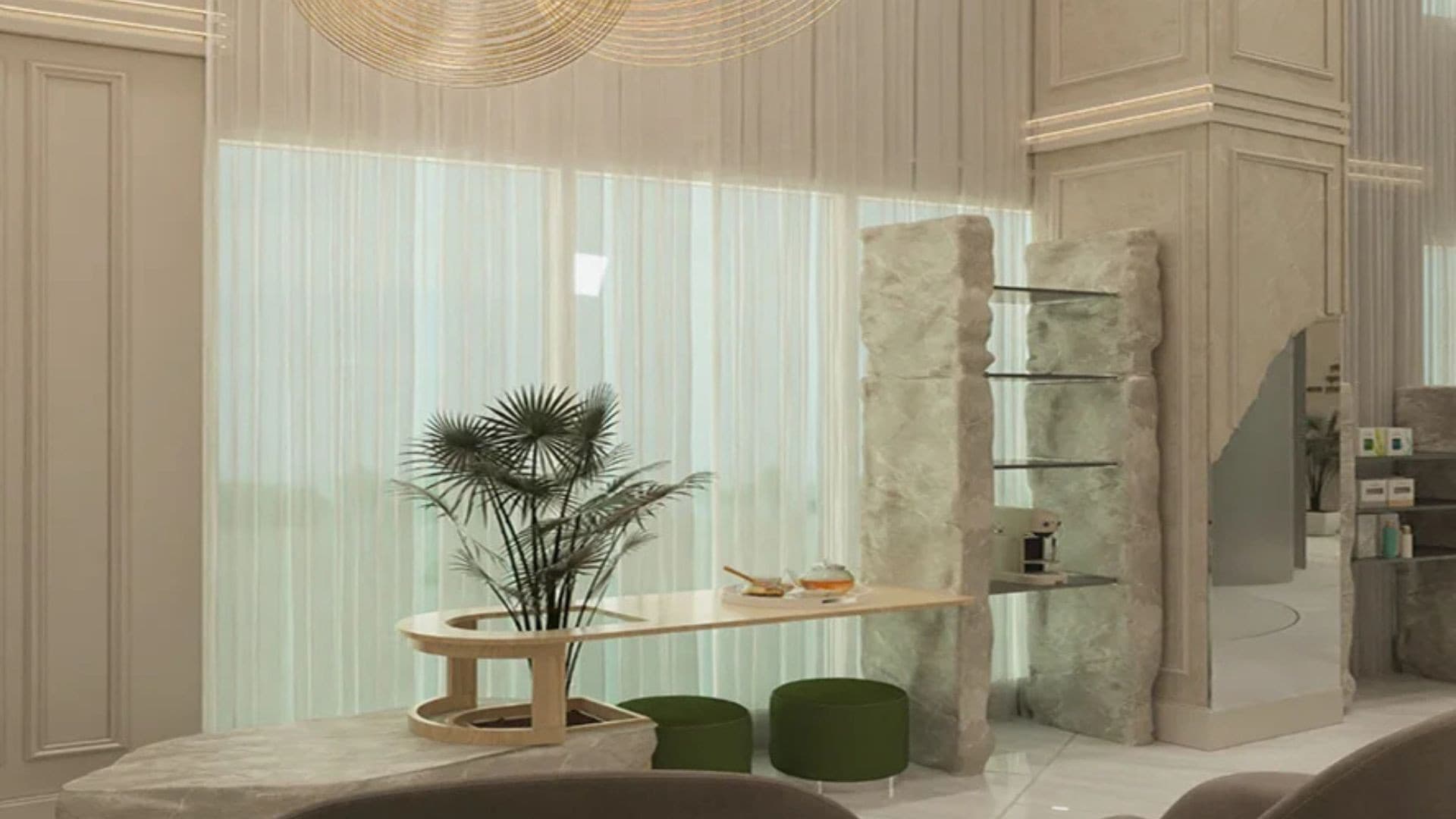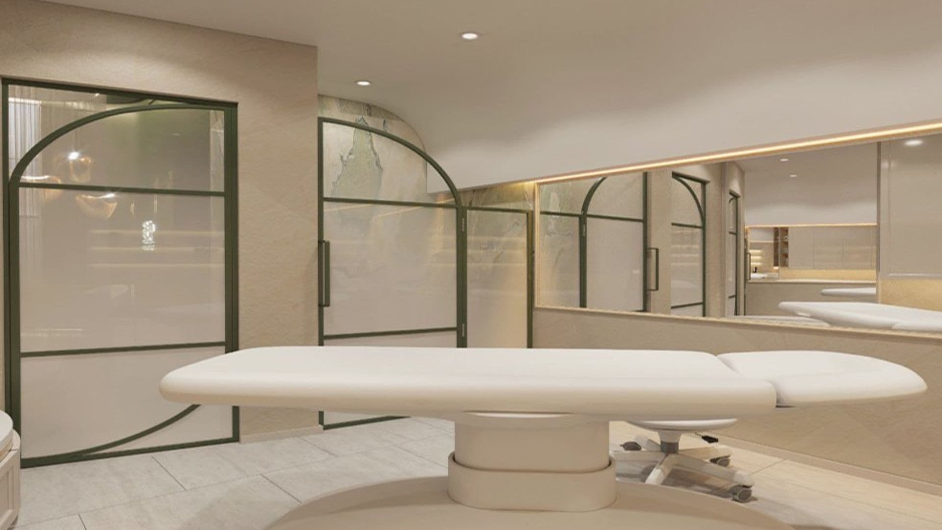 This clinic design embodies a serene and sophisticated aesthetic, blending natural elements with modern elegance to create a calming environment. Soft, neutral tones and rich green accents evoke a sense of tranquillity, while warm lighting enhances comfort and relaxation. Sleek, curved furnishings and arched design elements introduce a refined yet inviting atmosphere. High-end materials such as marble, glass, and wood contribute to a luxurious feel, reinforcing a sense of professionalism and care. Thoughtfully placed greenery, soft textures, and minimalistic decor promote wellness and serenity, making the space both functional and aesthetically pleasing for patients and staff alike.