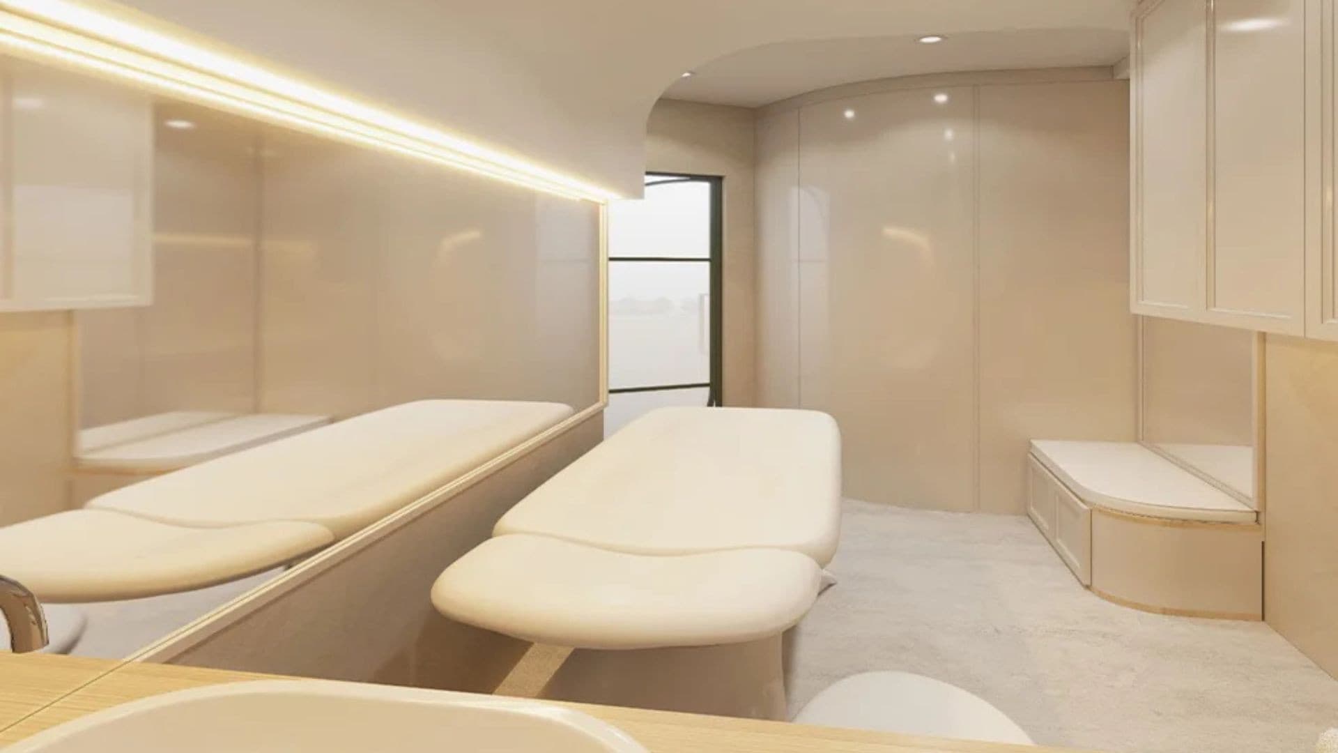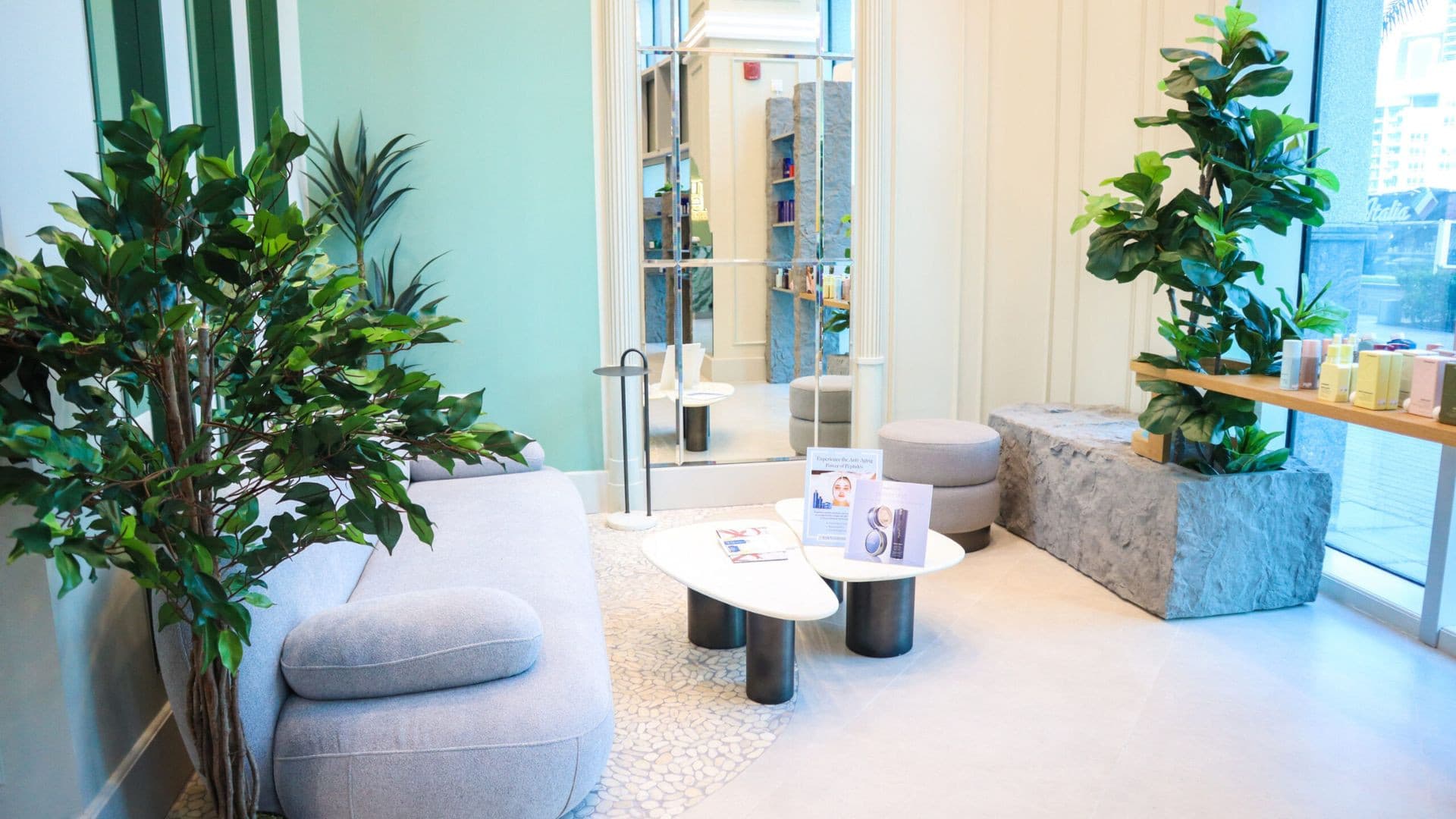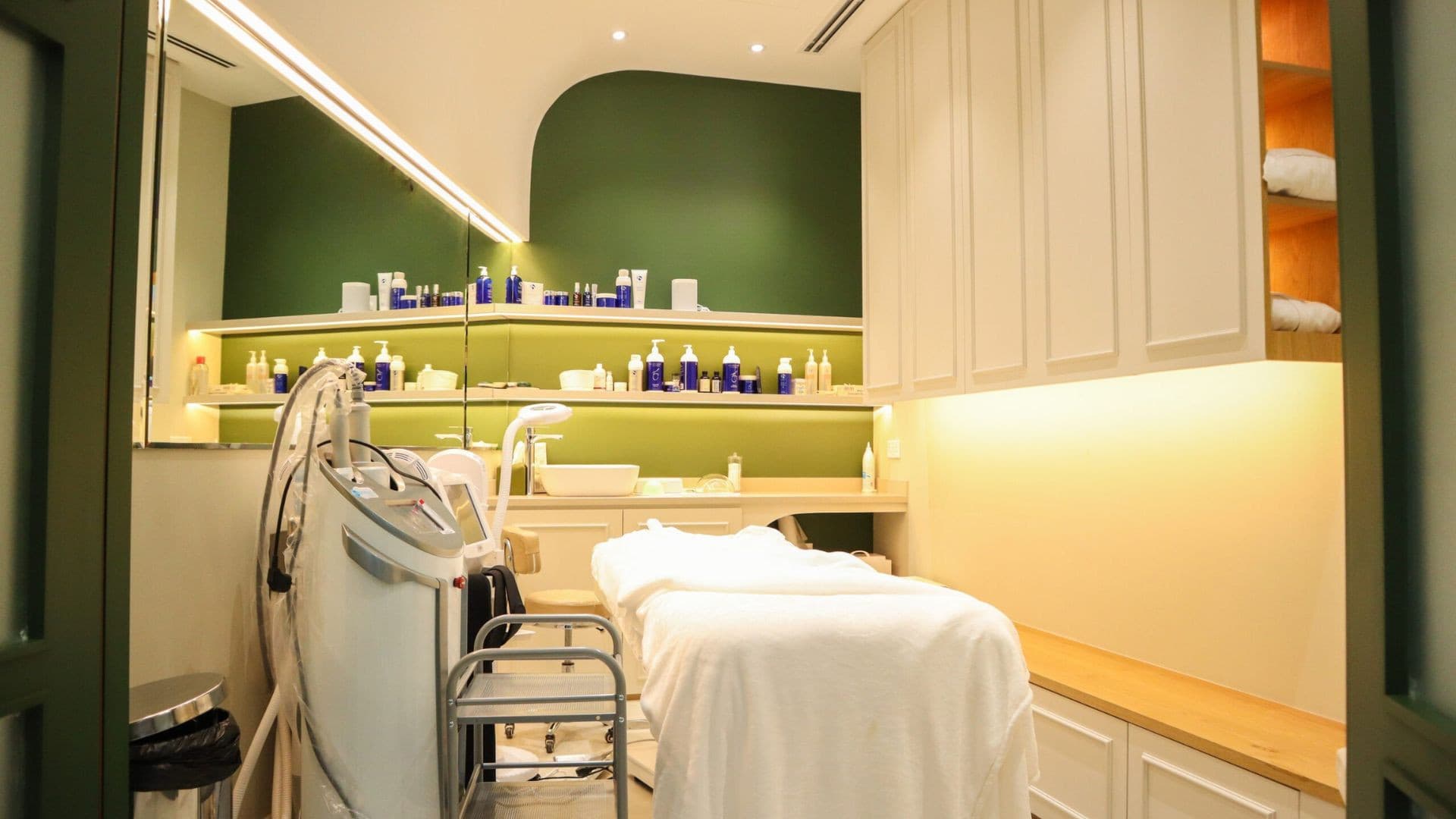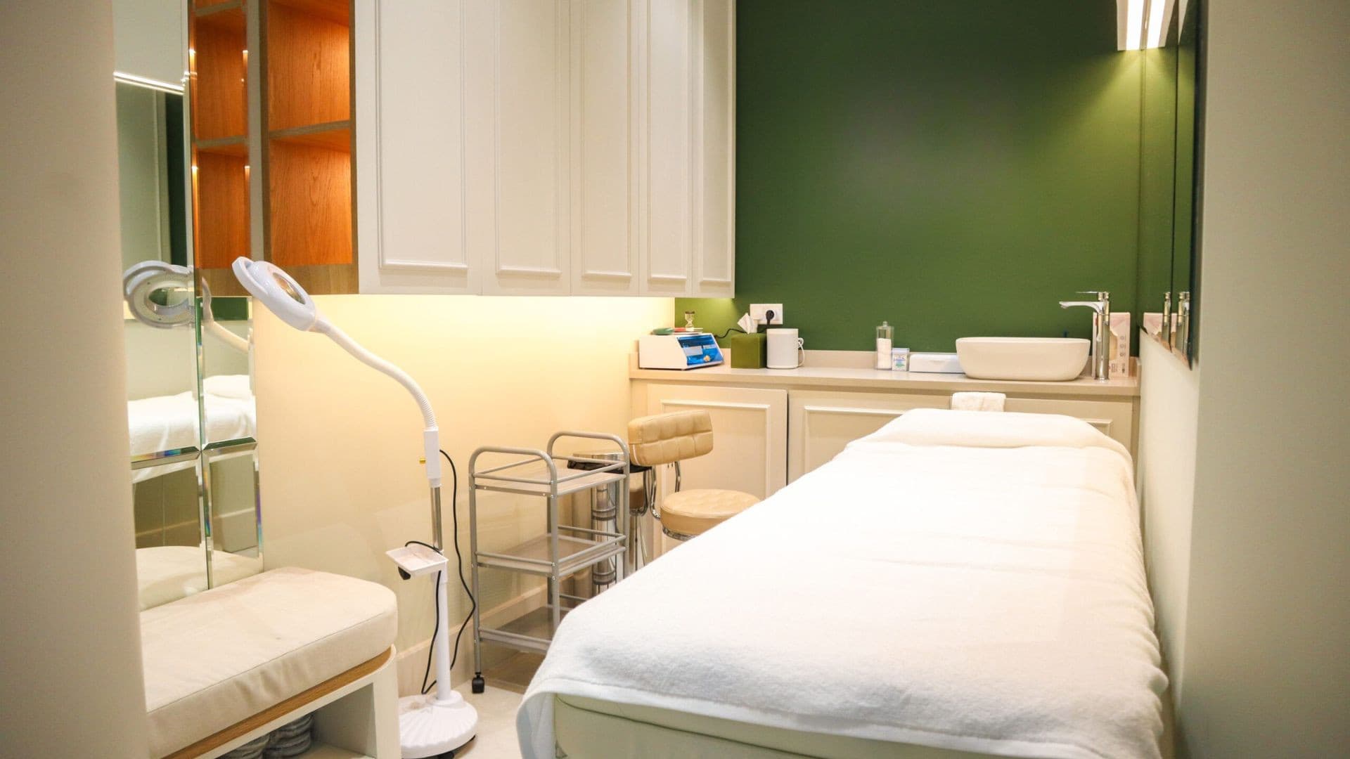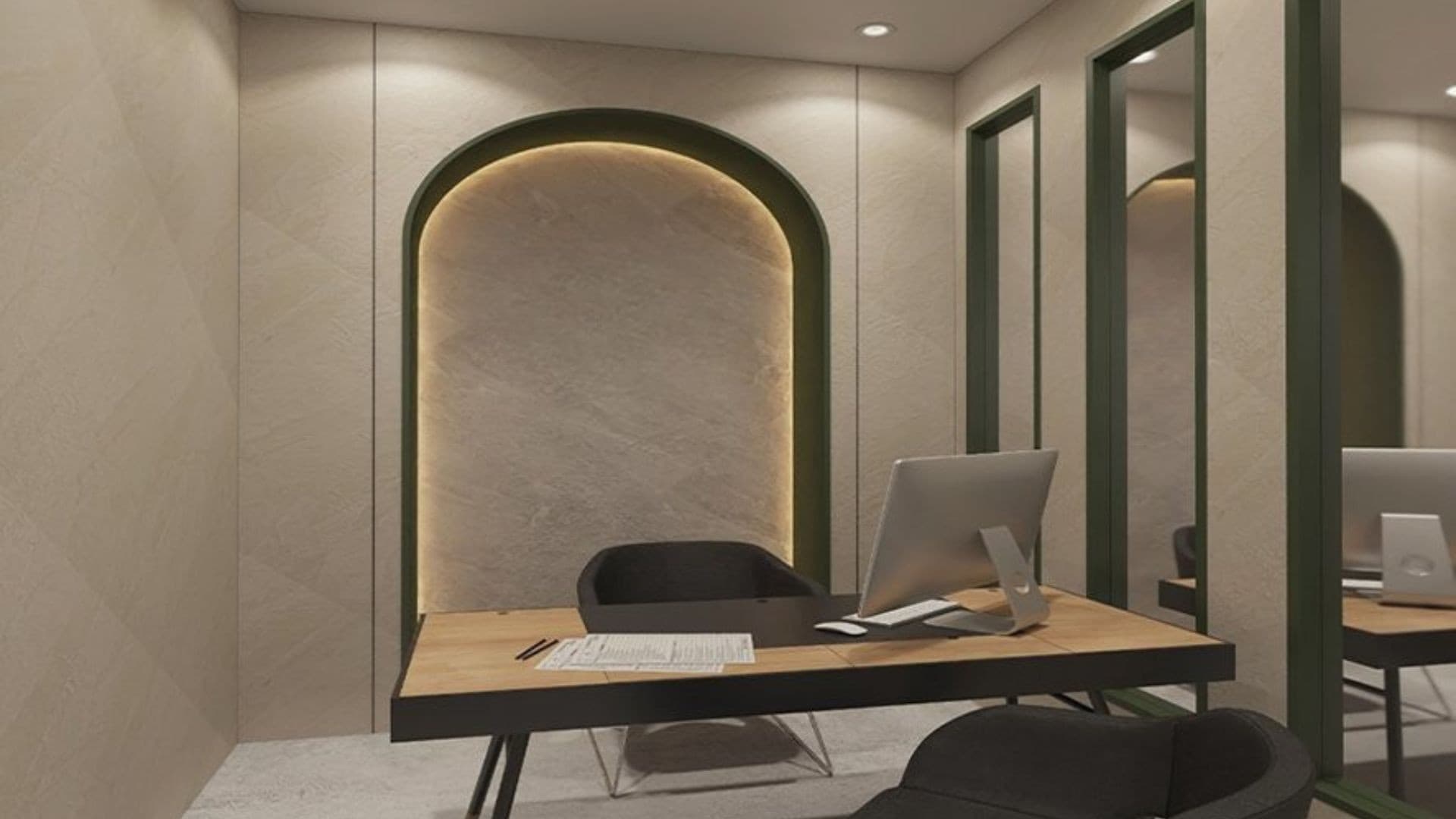 This clinic design embodies a serene and sophisticated aesthetic, blending natural elements with modern elegance to create a calming environment. Soft, neutral tones and rich green accents evoke a sense of tranquillity, while warm lighting enhances comfort and relaxation. Sleek, curved furnishings and arched design elements introduce a refined yet inviting atmosphere. High-end materials such as marble, glass, and wood contribute to a luxurious feel, reinforcing a sense of professionalism and care. Thoughtfully placed greenery, soft textures, and minimalistic decor promote wellness and serenity, making the space both functional and aesthetically pleasing for patients and staff alike.