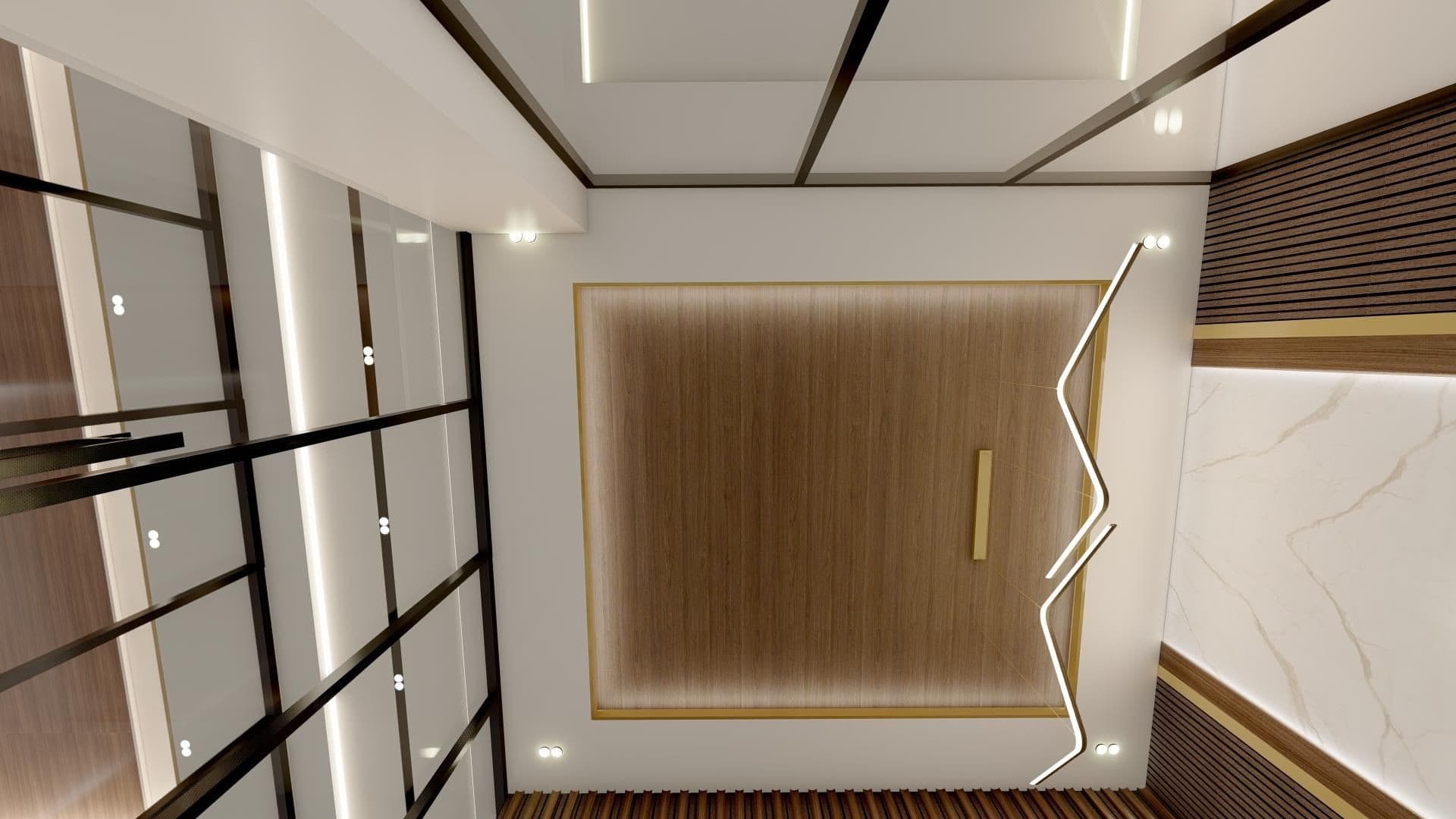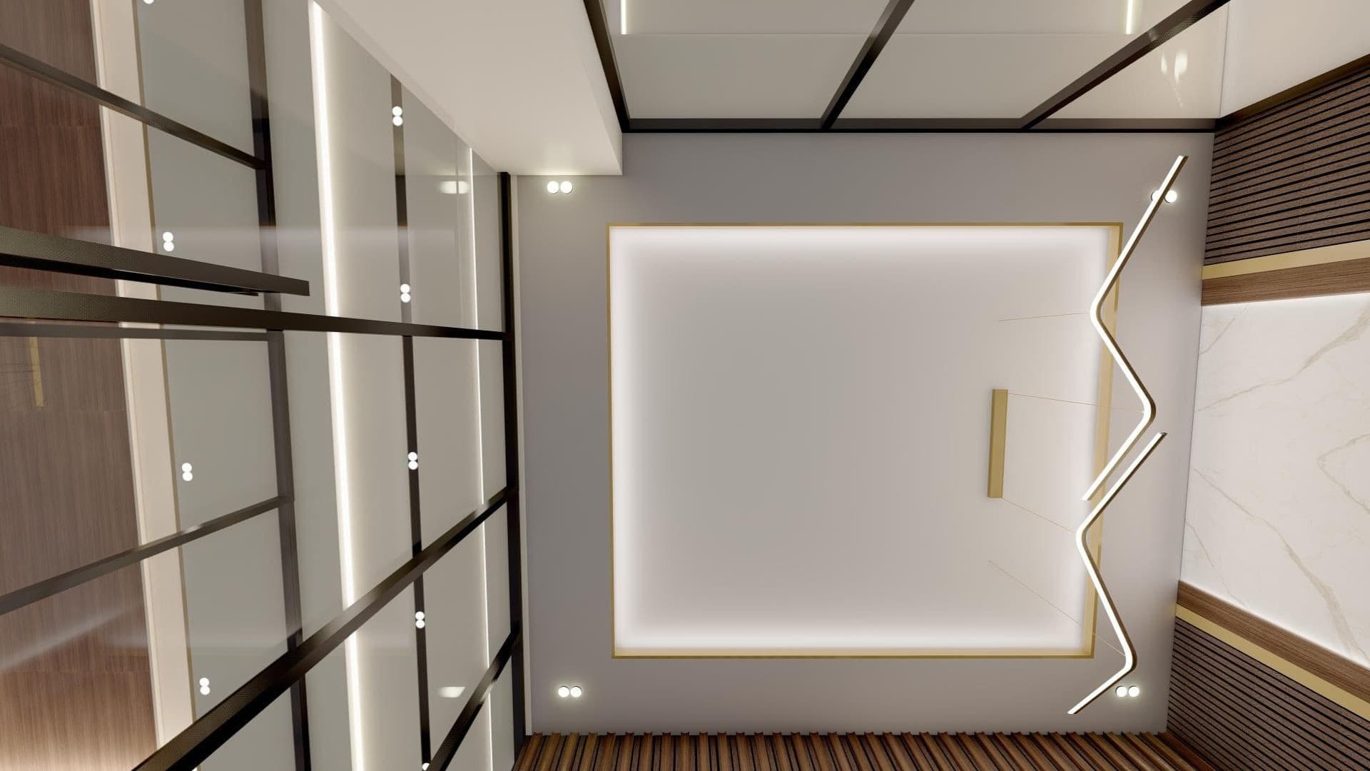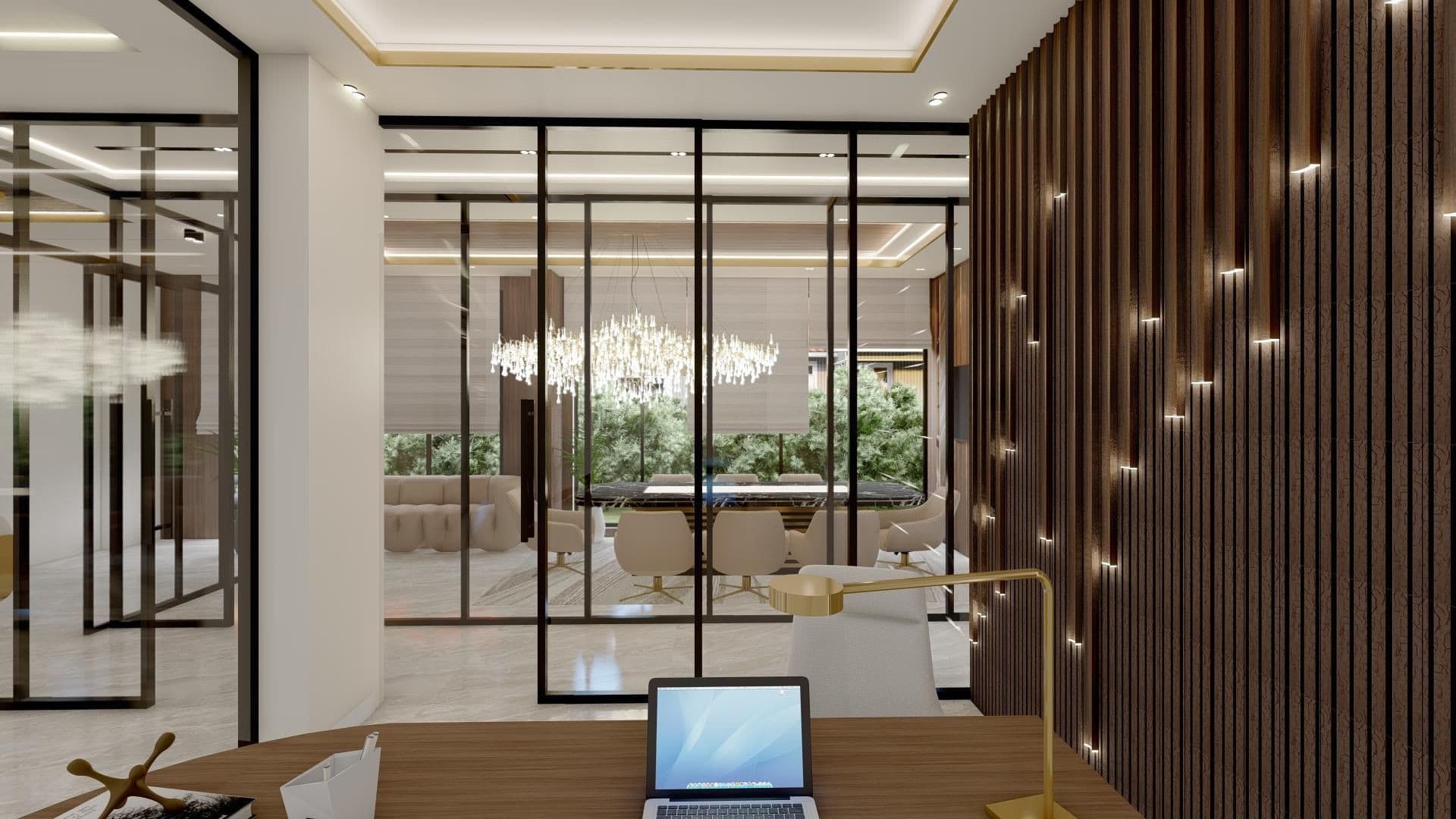 This project showcases a luxurious executive office design that seamlessly blends modern elegance with functional sophistication. Featuring a curved desk, tufted chair, marble accents, and textured wooden panelling with integrated lighting, the space exudes professionalism and style. Neutral tones, gold detailing, and sleek finishes create a refined ambience, while glass partitions enhance the openness and contemporary appeal of the office. This design is a perfect balance of aesthetics and practicality, tailored to inspire productivity in a sophisticated workspace.