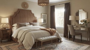 Layered textures create a warm and cocooning atmosphere: quilted bedspreads, woven throws, and tactile headboards. Add mood lighting with globe bedside lamps or rattan pendants. Add a touch of glamour with a mirrored or brass-trimmed dressing table.