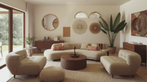 Embody the feeling: Use rounded sofas, arched mirrors, scalloped-edge decorations, or wall cutouts in the shape of crescents to incorporate this natural design aesthetic in your design project.