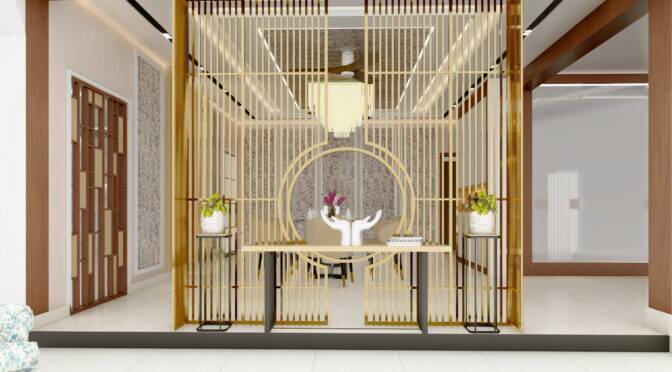 Decorative columns, framed wall panels, and gold-accented partitions helped define the space without blocking light or circulation. This allowed the dining area to feel connected to adjacent spaces while still maintaining its own identity.