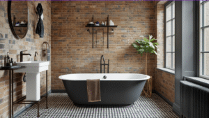 Industrial bathrooms draw inspiration from urban design, incorporating raw materials like concrete, exposed brick, and metal finishes. Industrial lighting and reclaimed wood elements introduce warmth and character, balancing the robust aesthetic.