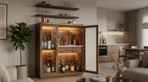 Perfect for small homes or apartments, a home cocktail bar cabinet keeps everything organised and stylish. Look for pull-out shelves, glass-front doors, or built-in lights that add flair without taking up too much space.